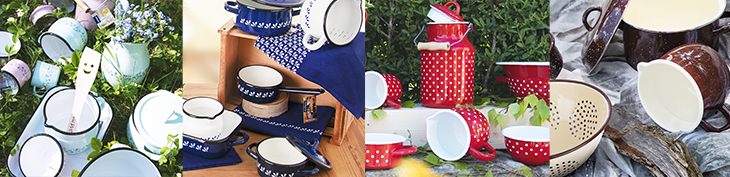 - smaltované nádobí LOUKA – jemné pastelové odstíny se hodí do světlých interiéru chalup i domácností, odkazují na příjemný francouzský styl bydlení. Navíc je kolekce nádobí doplněna o stylové kousky, od ubrousků a termosek až po krásné knihy k uchovávání rodinných receptů