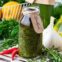 – je argentinská salsa podávaná ke grilovanému masu. Z hladkolisté petrželky, oregana, rozmarýnu, česneku a dalších přísad spojených olivovým olejem vznikne voňavá bylinková omáčka. Ideálně, když máte bylinky, které vám zrovna rostou na zahradě nebo na balkoně v truhlíku nebo květináči.