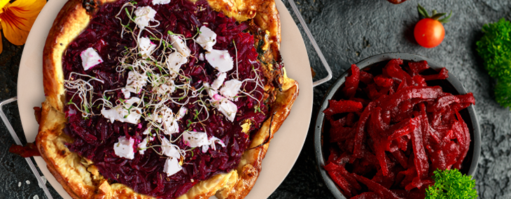 Troubu předehřejte na 170 °C. Na pečicí kámen položte těsto rozválené na kruh o průměru cca 35 cm. V misce promíchejte zakysanou smetanu, žloutky, sůl a kmín. Tuto smetanovou směs rozetřete na těsto, ale ne až do kraje, nechte 5 centimetrů od kraje volných. Řepu nastrouhejte nahrubo na smetanovou náplň. Fetu rozdrobte a přidejte ji na řepu. Okraje těsta postupně po malých kouscích přehněte kolem dokola přes náplň tak, aby vznikl rantl a náplň nemohla vytéct mimo těsto.
