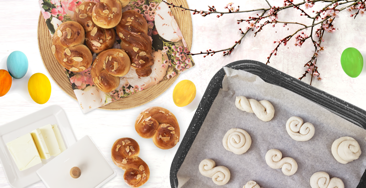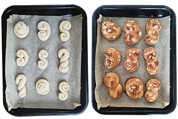 Jidáše položíme na plech s pečicím papírem a necháme ještě 30 minut kynout. Třetí žloutek rozmícháme a jidáše jím potřeme, získají po upečení krásnou hnědou barvu a lesk. Nakonec je lze posypat plátky mandlí nebo je necháme hladké.
