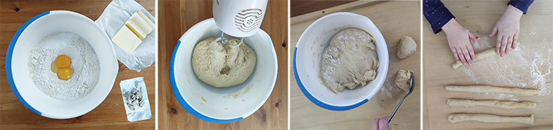 Na lehce pomoučený vál vykrajujeme lžící větší kousky a každý vyválíme na pramen průměru 1-1,5 cm. Jidáše by měly mít tvar stočené oprátky, ale můžeme tvořit spirály, šneky či ptáčky, fantazii se meze nekladou. S tvarováním určitě rády pomohou děti.