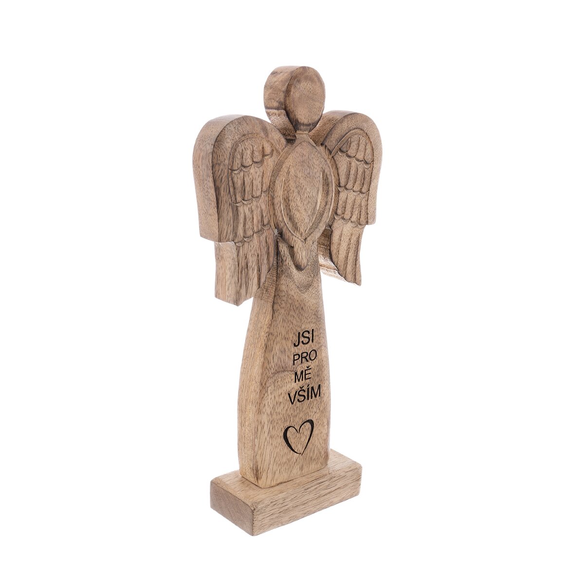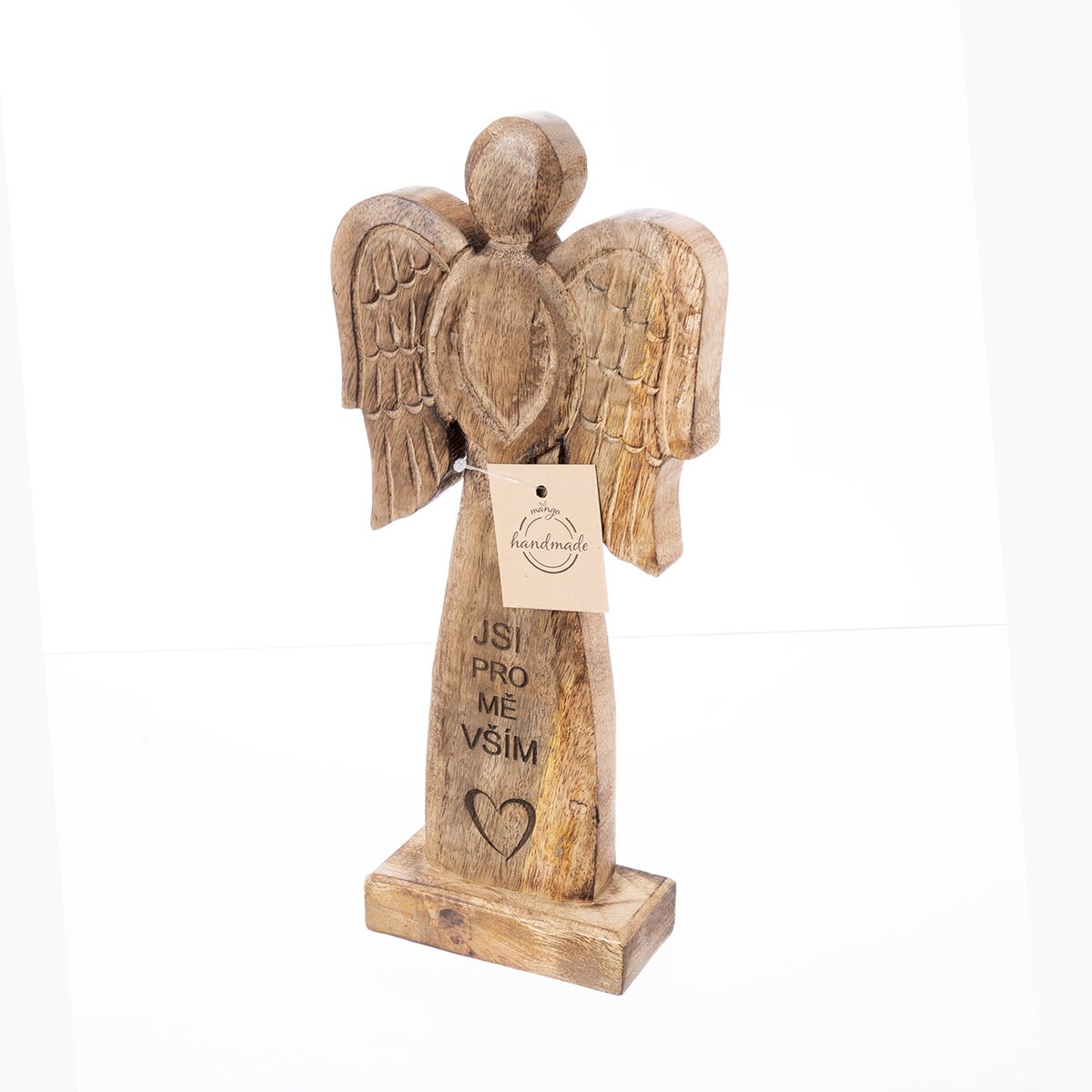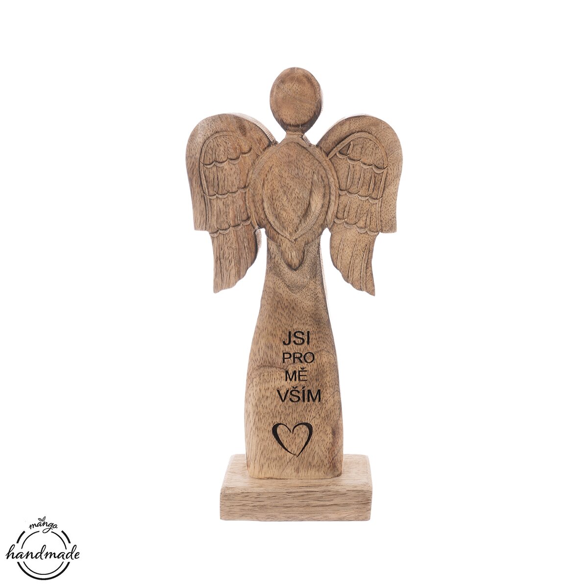 Na přední straně anděla je nápis „Jsi pro mě vším“, který dodává celé dekoraci hluboký osobní význam a činí z ní krásný dárek pro výjimečného člověka. Anděl je vyroben z mangového dřeva a jeho výška je 30 cm.