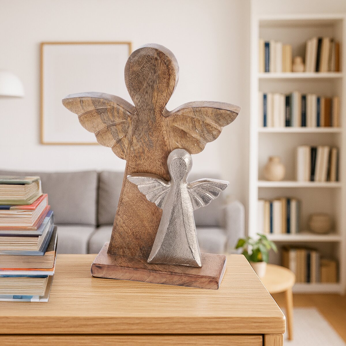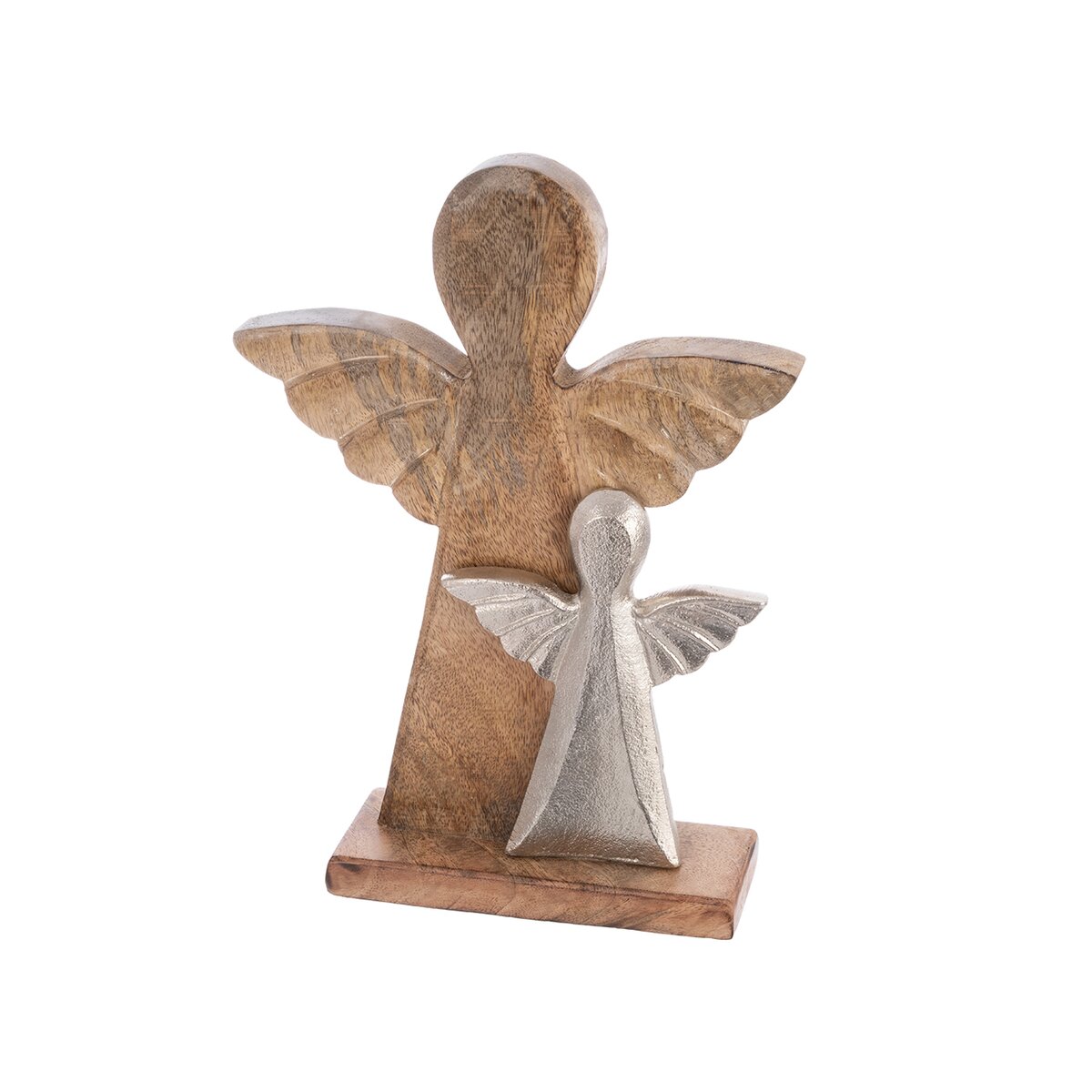 Tato stylová dekorace anděla je vyrobená z mangového dřeva a doplněná menším kovovým andělem se šířkou 14 cm a výškou 17,5 cm, se kterým tvoří elegantní a harmonický celek. Díky svému originálnímu designu se skvěle hodí jako vkusný doplněk do interiéru, ale potěší i jako milý dárek.