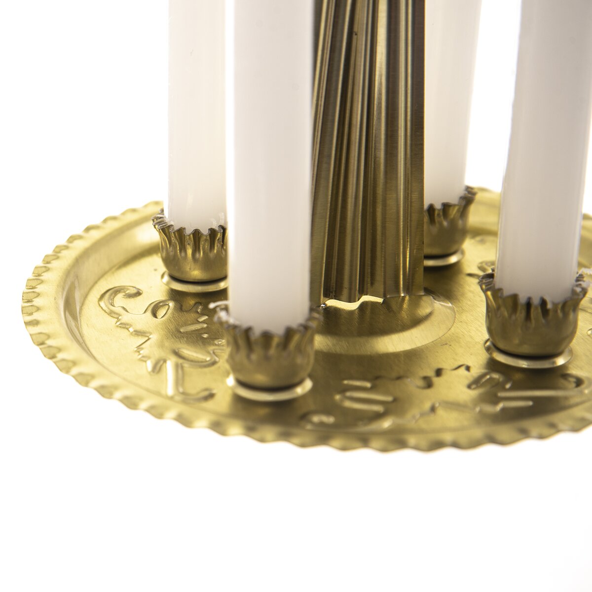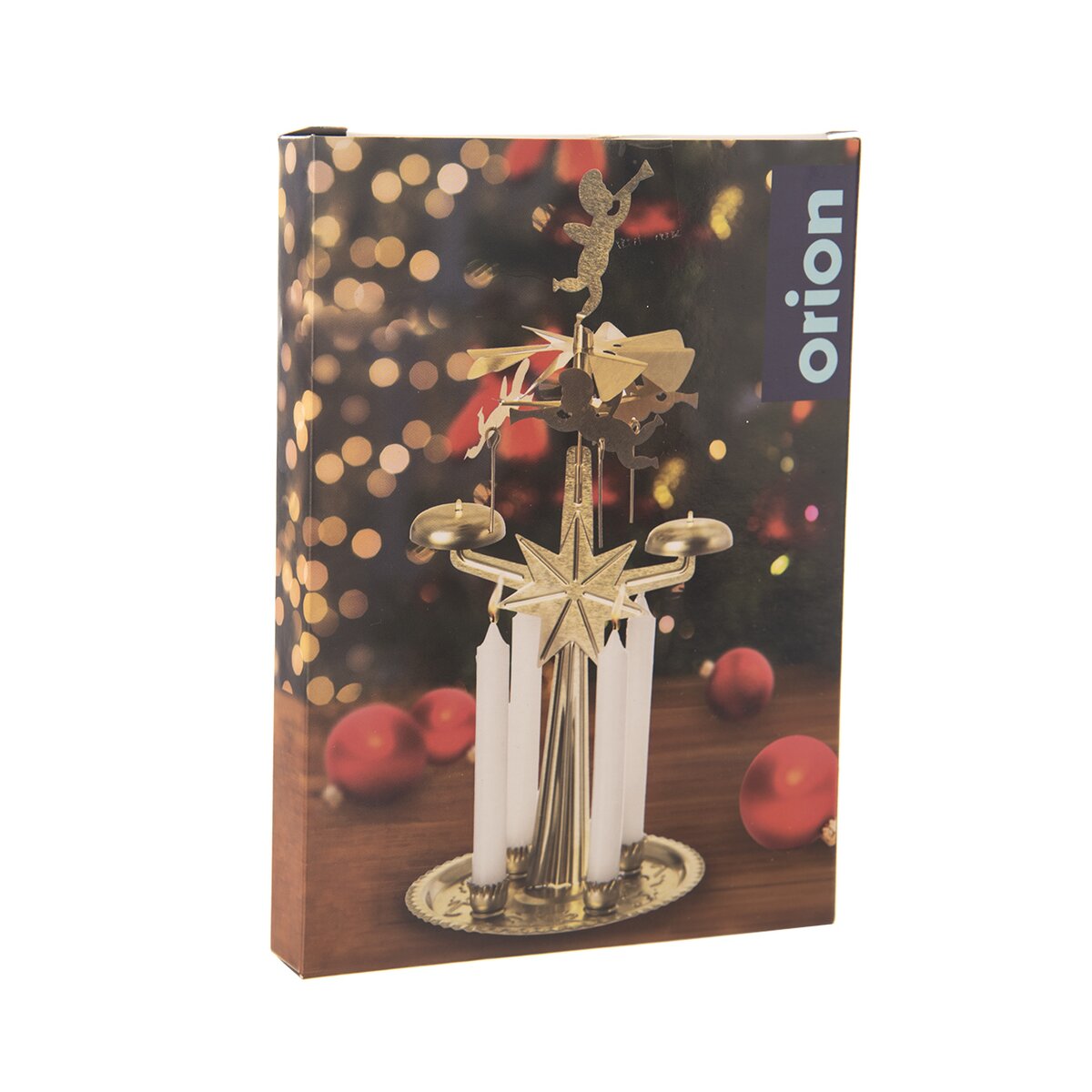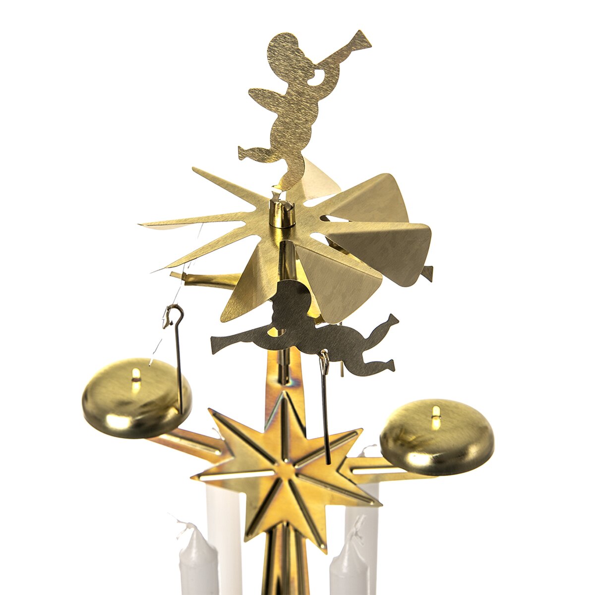 Tato vánoční dekorace výšky 27 cm, vyrobená z pozinkované oceli, je složena z několika částí. Na základně jsou uchyceny 4 bílé svíčky, které po zapálení roztočí horní část s pletujícími andílky. Ty jsou součástí balení.