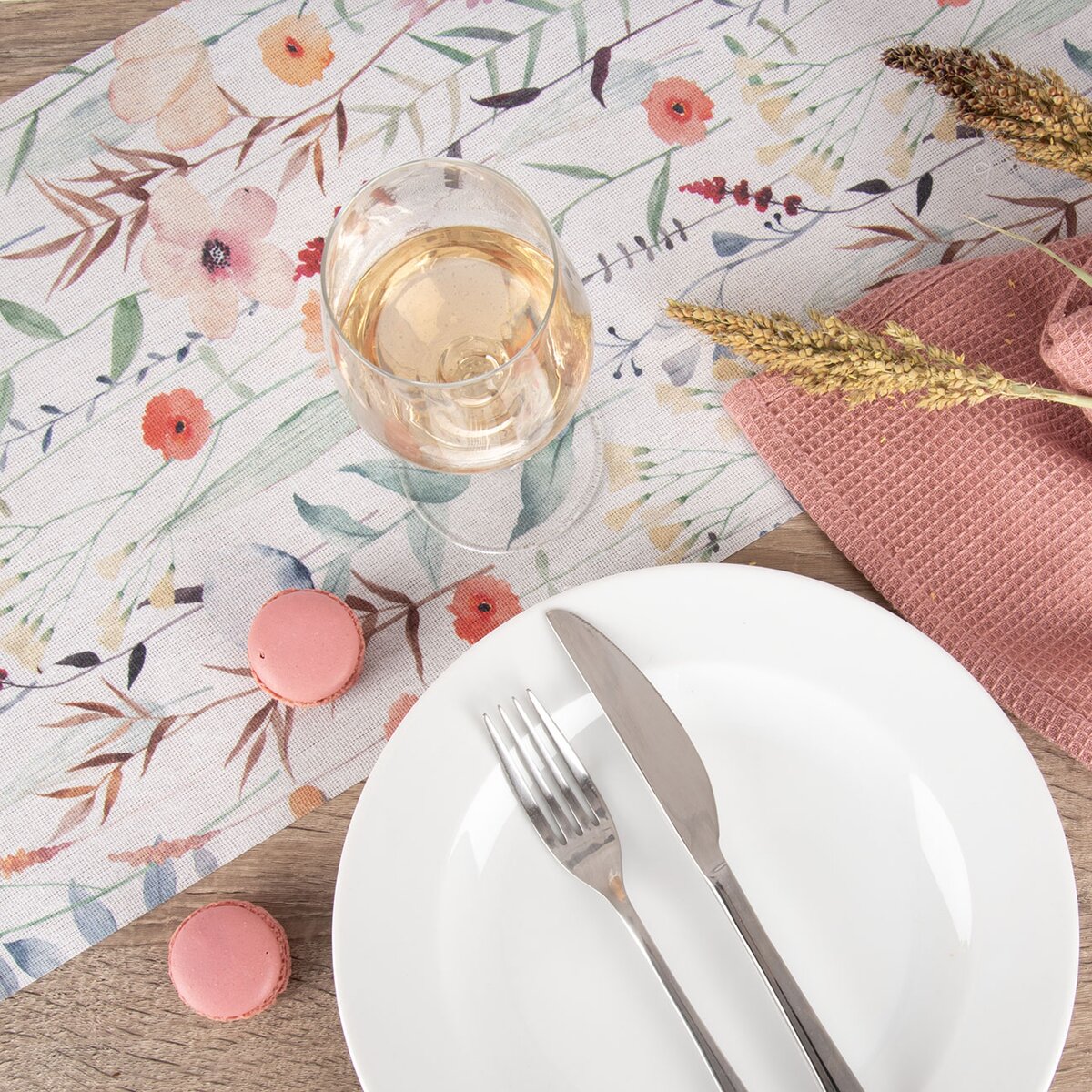 Kód produktu X14021Režný běhoun s motivem květin na neutrálním podkladu je určen na střed stolu. Ozdobí stůl v kuchyni, jídelně i obývacím pokoji i na terase.