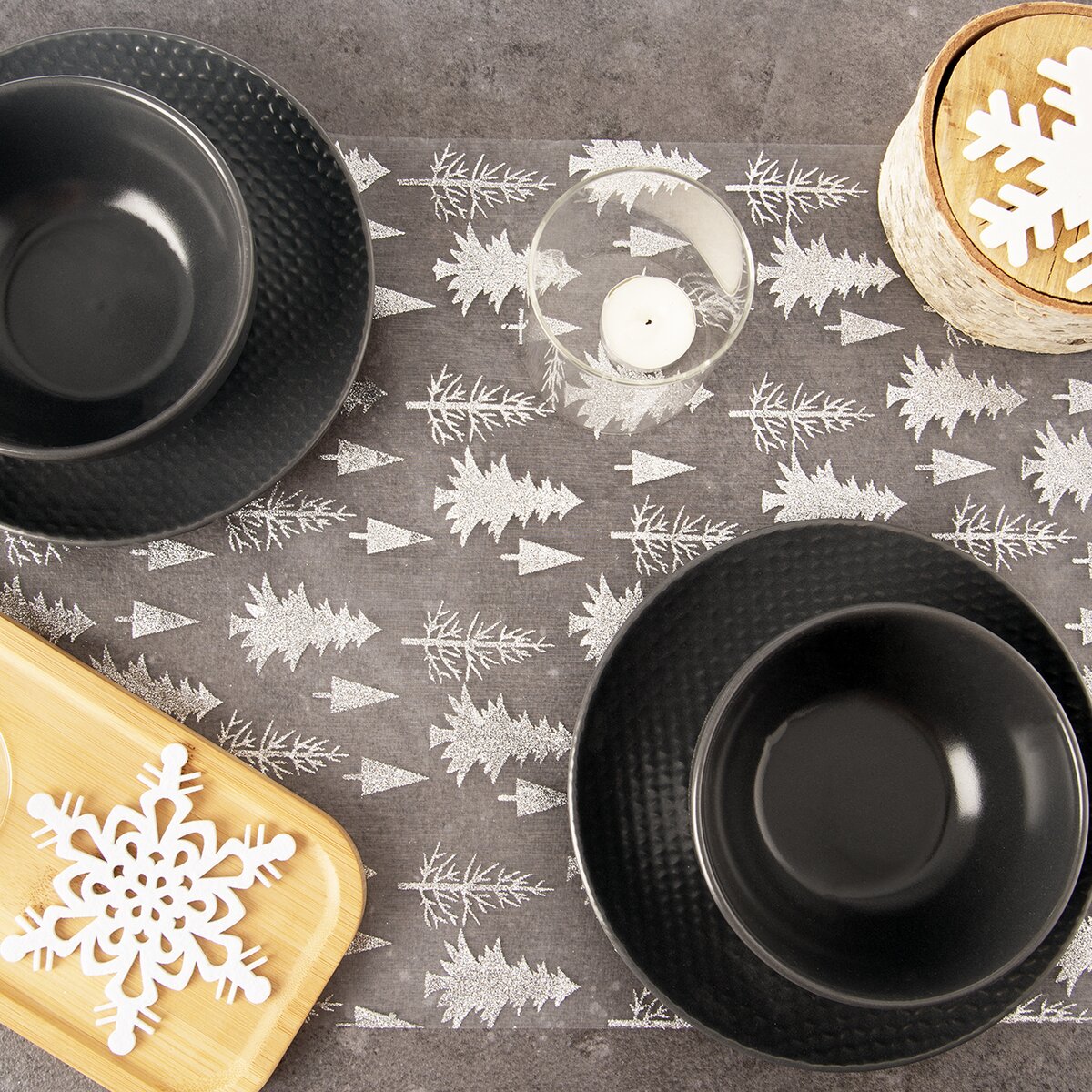 Kód produktu 728021Průhledný běhoun s motivem stříbrných stromečků, vyrobený z polyamidu, je určen na střed stolu. Ozdobí sváteční stůl v kuchyni, jídelně i obývacím pokoji.
