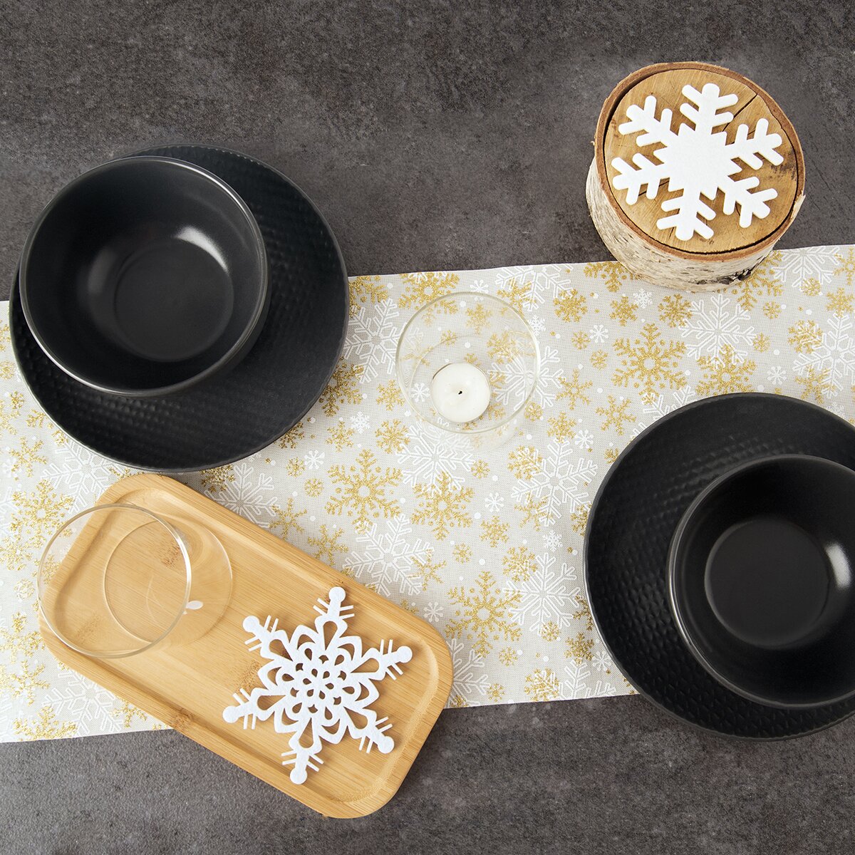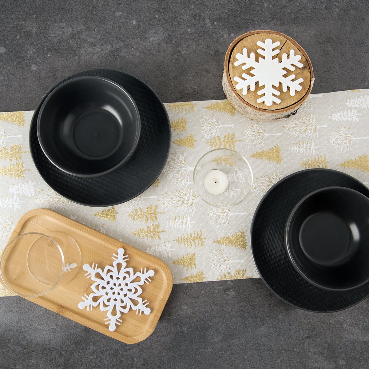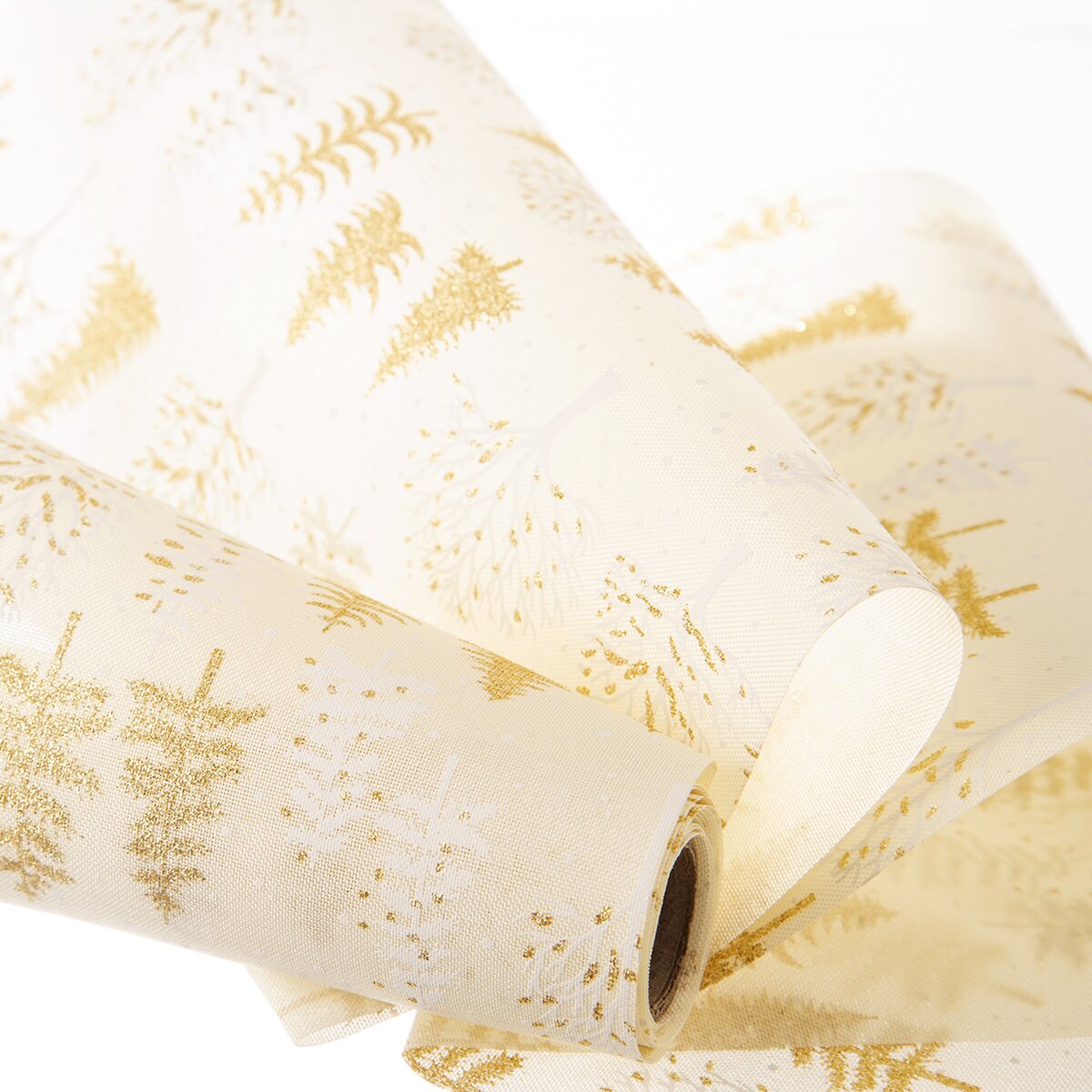 Kód produktu 728023Světlý běhoun s motivem bílých a zlatých stromečků a vloček, vyrobený z polyesteru, je určen na střed stolu. Ozdobí sváteční stůl v kuchyni, jídelně i obývacím pokoji.
