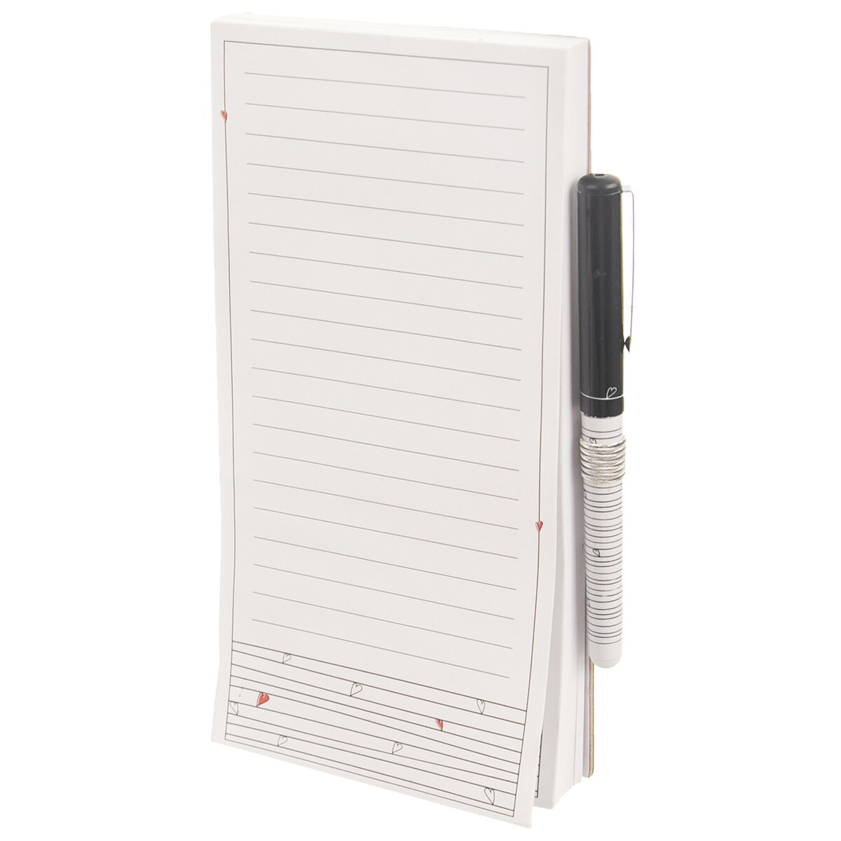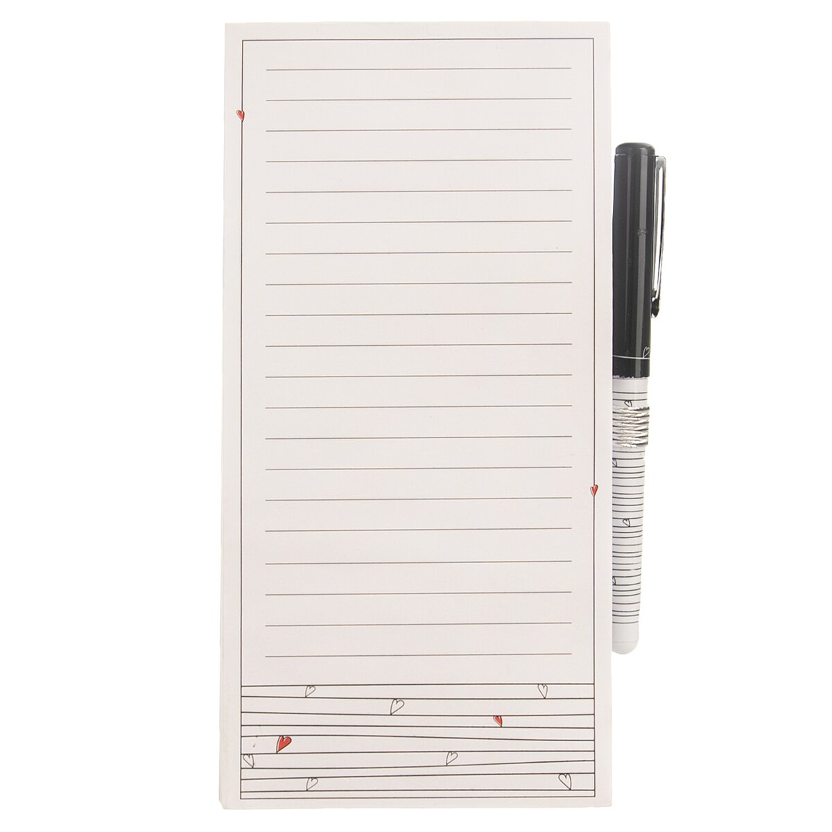 Kód produktu 741182Poznámkový linkovaný blok s drobnými srdíčky a propiskou můžete mít v kuchyni pohodlně při ruce, pokud využijete magnetu na jeho zadní straně a připevníte ho na lednici nebo jinou kovovou plochu. Využijete jej na soupis nákupu i pro úkoly nebo vzkazy.