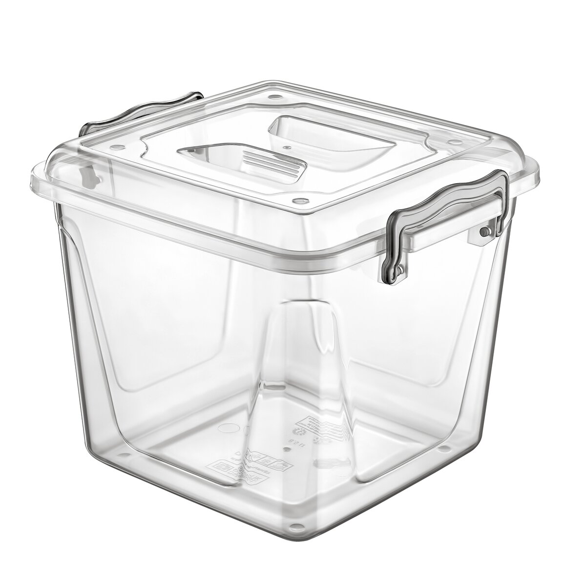 Kód produktu 122619Nízký průhledný úložný box o objemu 8,5 l s víčkem na dva pevné klipy. Je z pevného plastu a má tvar čtverce.