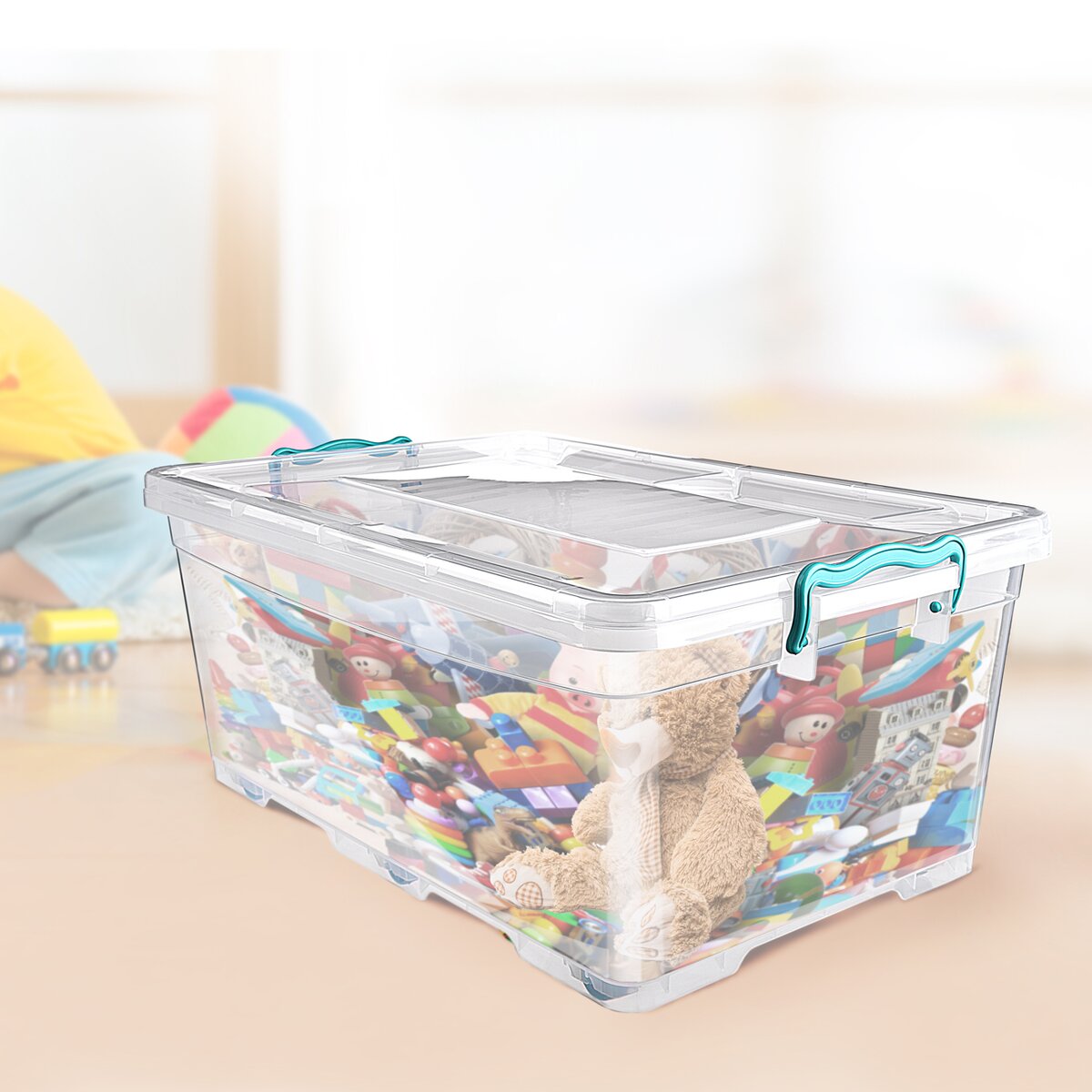 Kód produktu 122646Vysoký průhledný úložný box o objemu 40 l s víčkem na dva pevné klipy. Je vyrobený z pevného plastu a má 6 praktických koleček.