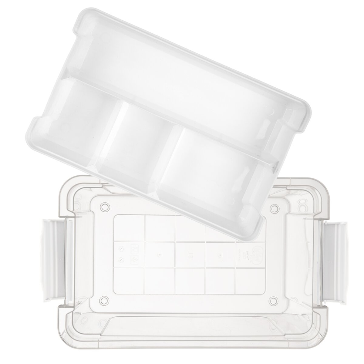 Vklad lze jednoduše vyjmout a pod ním ještě zbyde místo na další maličkosti. Je uzavřen víkem s postranními klipy a s držadlem určeným k přenášení. A pokud jich bude víc, snadno je naskládáte na sebe, díky průhlednému plastu PP budete mít přehled, co který box obsahuje.