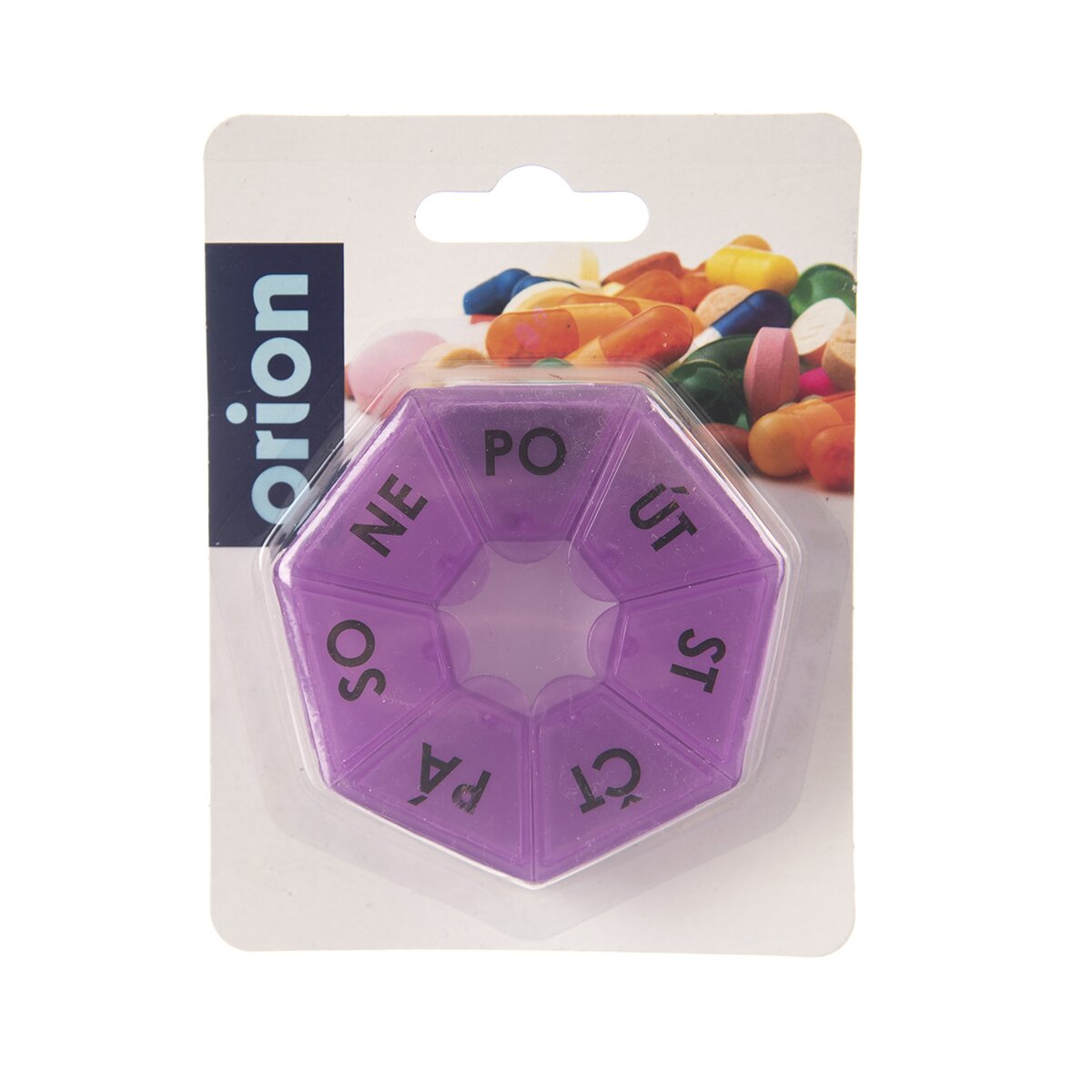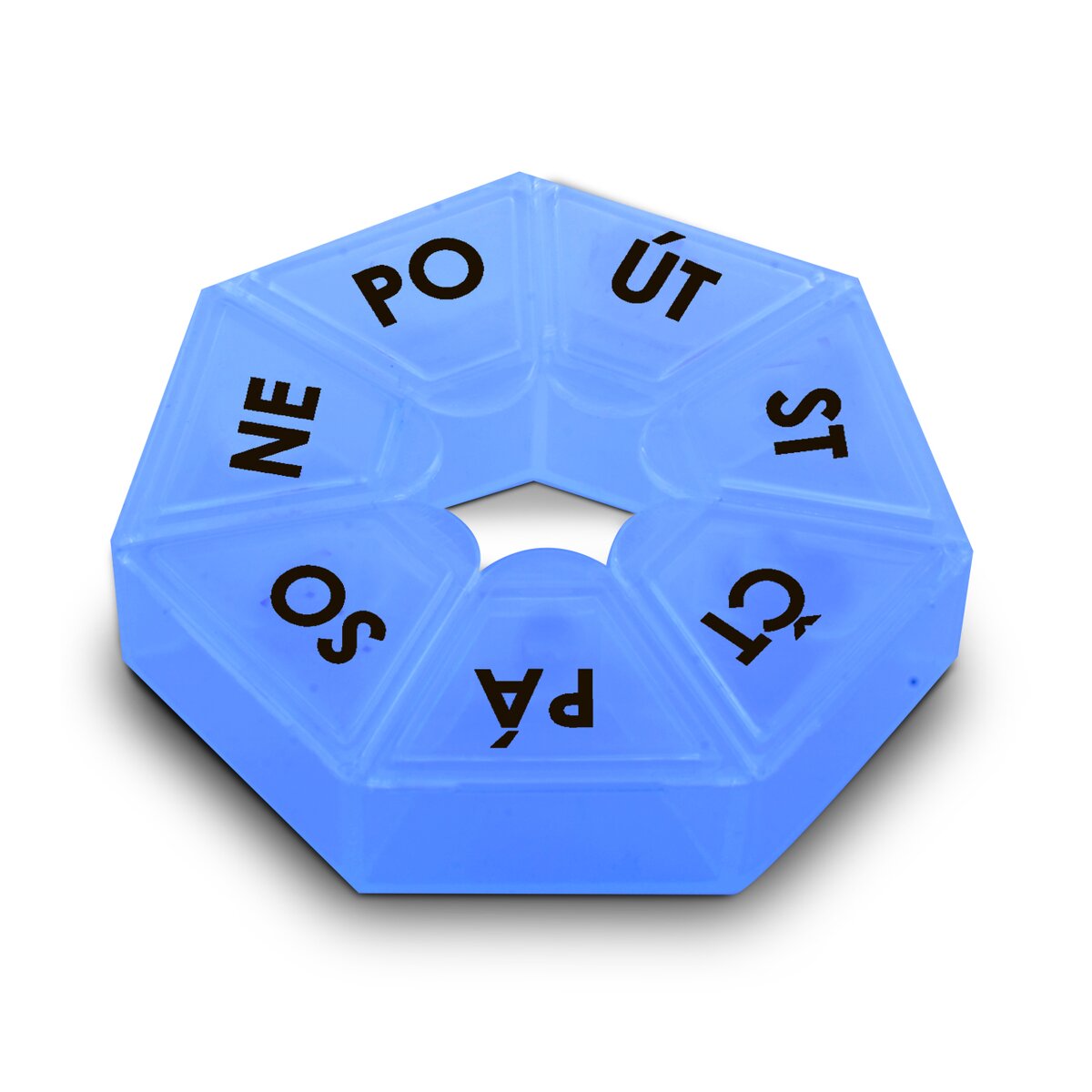 Kód produktu 126243Kulatý poloprůhledný box na léky, se sedmi přihrádkami se zavíracími víčky a s označením dne, je určen k uložení léků. Je vyrobený z plastu a má průměr 7,5 cm.