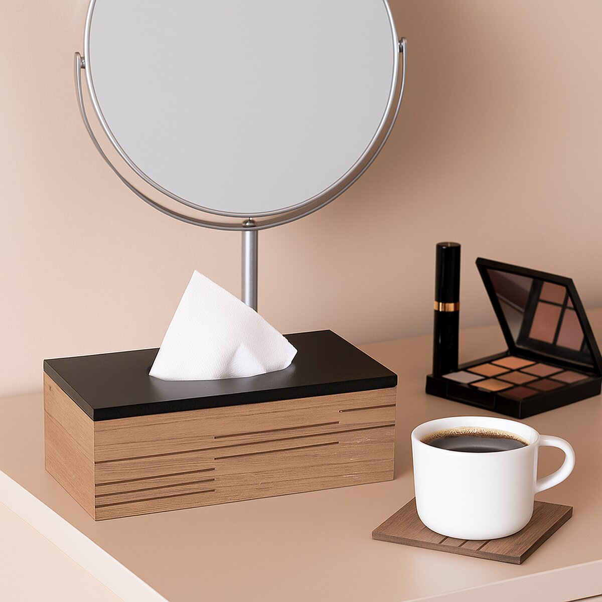 Bude zajímavým prvkem na jídelním stole, konferenčním stolku nebo u postele vždy, když budete kapesníček potřebovat. Ve spodní části je opatřen protiskluzovými silikonovými podložkami.