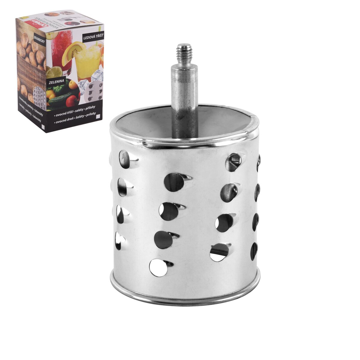Náhradní bubínek ke strojku na strouhanku vhodný ke strouhání okurek, brambor, jablek, zelí, ale také k výrobě tříště z kostek ledu na osvěžující nápoje... Materiál: kov. Rozměry: průměr 7,5 cm, výška 12 cm.
