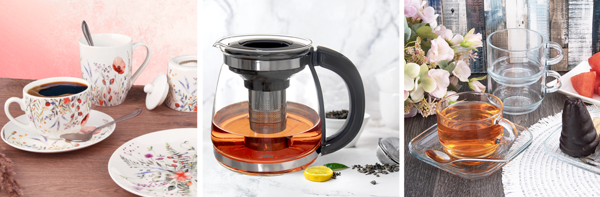 Sady hrnků, hrnků s podšálky jsou praktické, vynikne v nich nejen dobrý čaj, ale i latté, navíc jsou stohovatelné, takže zaberou jen málo místa při uložení. Díky tomu se hodí k použití v domácnosti, ve firemním baru či kuchyňce nebo při hotelové bufetové snídani, kde se hosté sami obslouží. A přípravu čaje nebo kávy zajistí nové konvice v kombinaci skla, kovu a černých prvků na rukojetích a víčku.