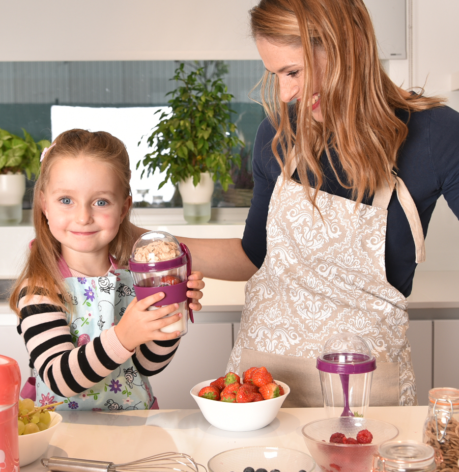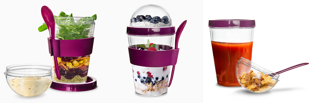 Poháry jsou transparentní, takže budete mít přehled o tom, co jste si na druhý den připravili do lednice a jsou doplněny odnímatelným zásobníkem, kam lze nasypat lupínky, semínka, oříšky nebo piškoty.