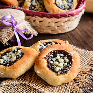Mezitím si připravíme náplně. Do jedné misky vložíme tvaroh a ostatní suroviny, z nichž vznikne pevnější tvarohová náplň. Dle libosti lze přidat i hrozinky. V druhé misce rozmícháme švestková povidla a dochutíme je např. skořicí nebo kapkou rumu. Pokud použijeme kupovaná povidla, je třeba je trochu zředit. Na to se podle zkušeností babiček hodí právě rum nebo řidší marmeláda. Řidší domácí povidla lze naopak zahustit strouhaným perníkem.