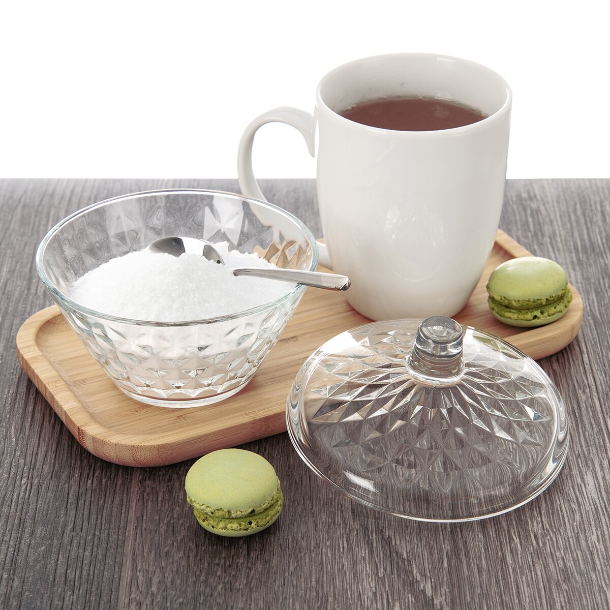 Skleněná cukřenka s plastickým dekorem je elegantní, hodí se k uložení kostkového, bílého krystalového cukru nebo cukru třtinového. V kombinaci s hezkými šálky a domácí bábovkou se bude vyjímat uprostřed stolu nebo na tácu, servírovaném hostům a rodině. Silnostěnné sklo na těle i víčku cukřenky je odolné, v případě potřeby ji lze mýt v myčce nádobí.