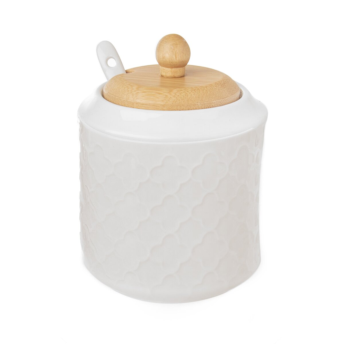Elegantní, bílá cukřenka s bambusovým víčkem a porcelánovou lžičkou se hodí do klasické, moderní i rustikální kuchyně. Společně s bílými šálky a podšálky podtrhne tato cukřenka příjemný dojem ze stolování. Její povrch je pokryt jemným reliéfem, díky kterému skvěle vypadá a navíc nevyklouzne jen tak z ruky, pokud si vaši hosté chtějí osladit kávu nebo čaj.