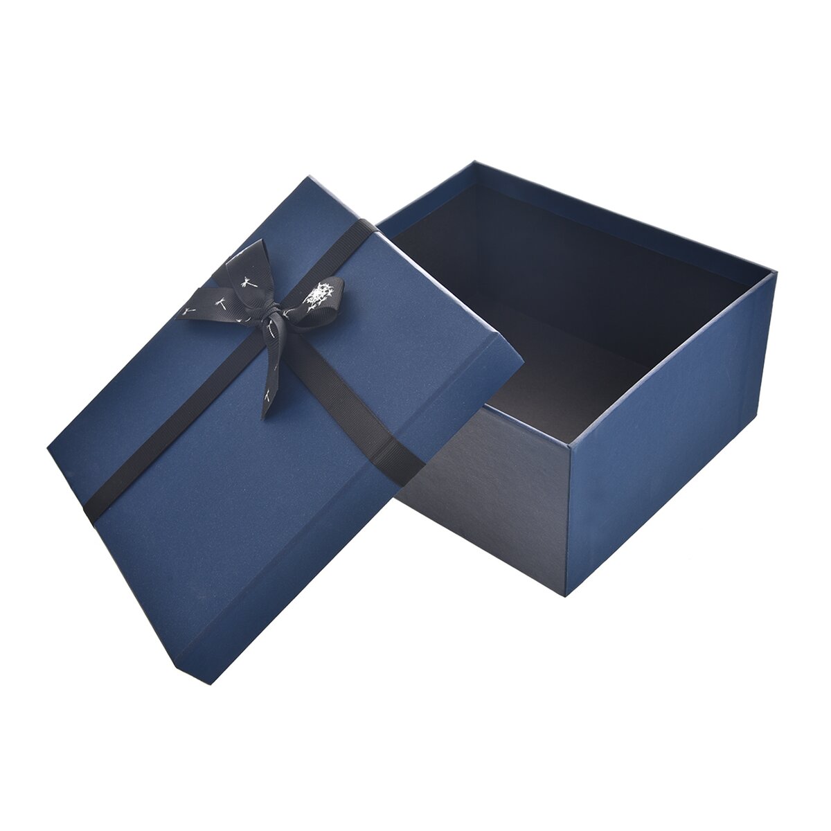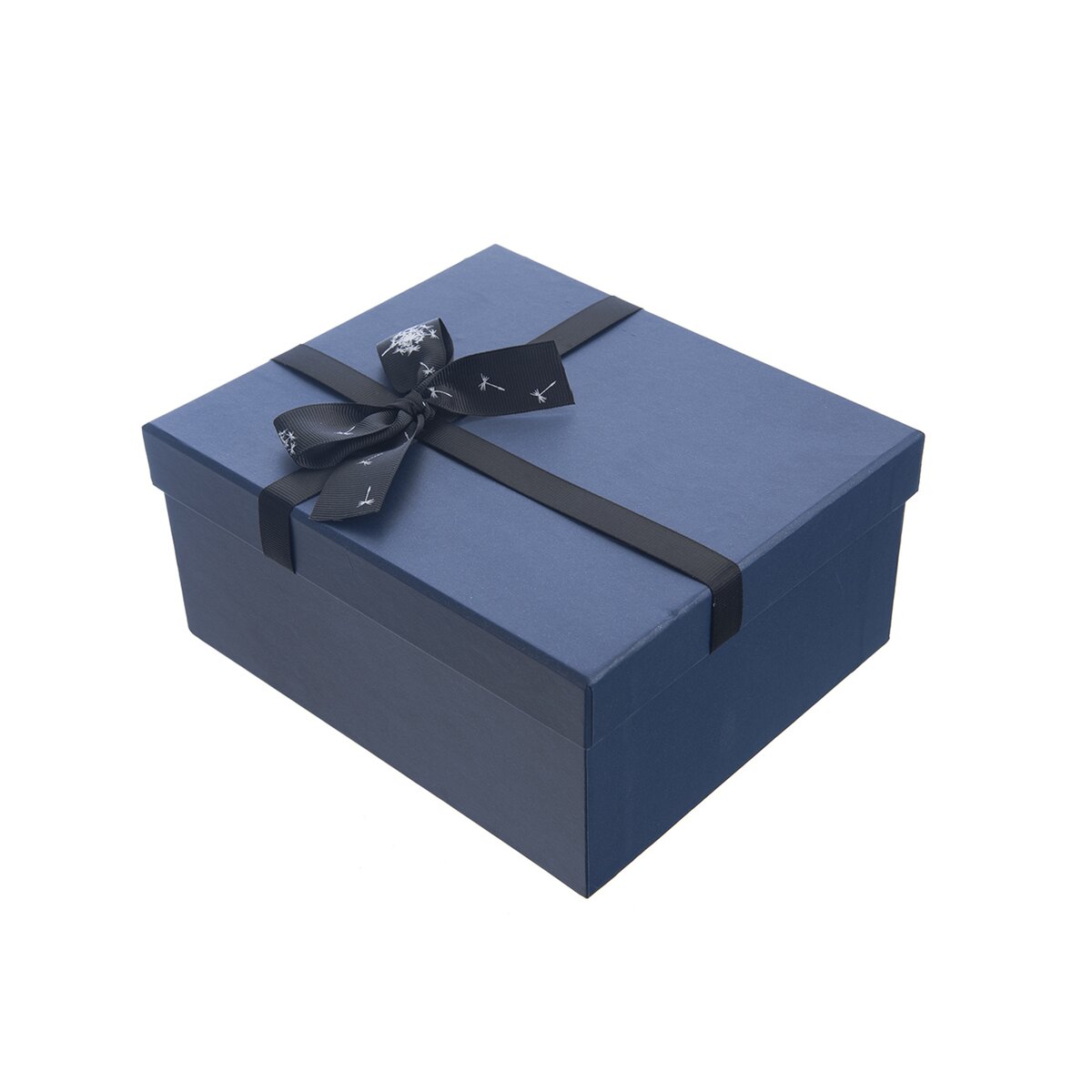 Kód produktu 822737Matná modrá krabice z kraftového papíru má na víku elegantní černou stuhu, zdobenou motivem chmýří z pampelišek. Určena k pohodlnému balení dárků.