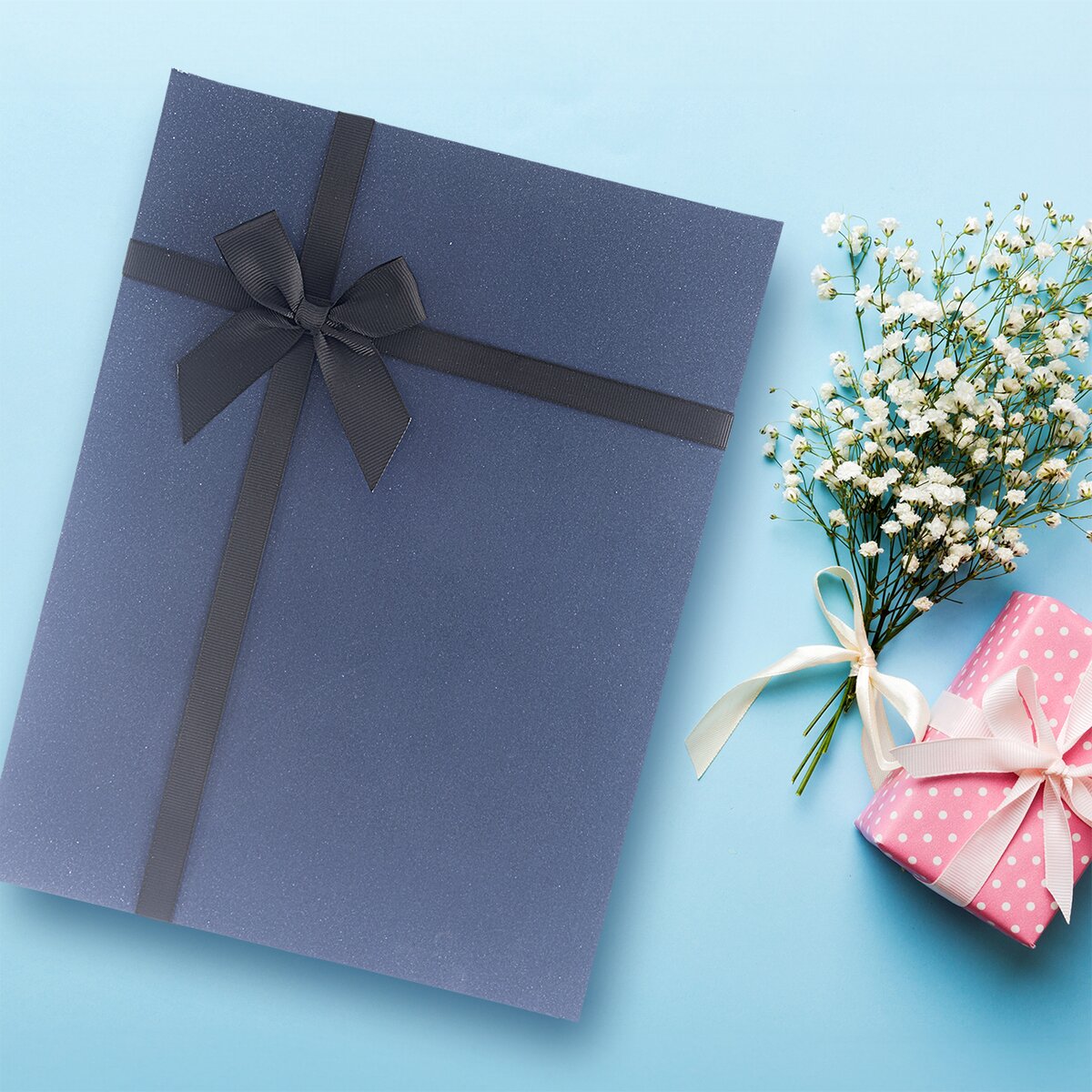 Kód produktu 822738Matná modrá krabice z kraftového papíru má na víku elegantní černou stuhu a je určena k pohodlnému balení dárků.