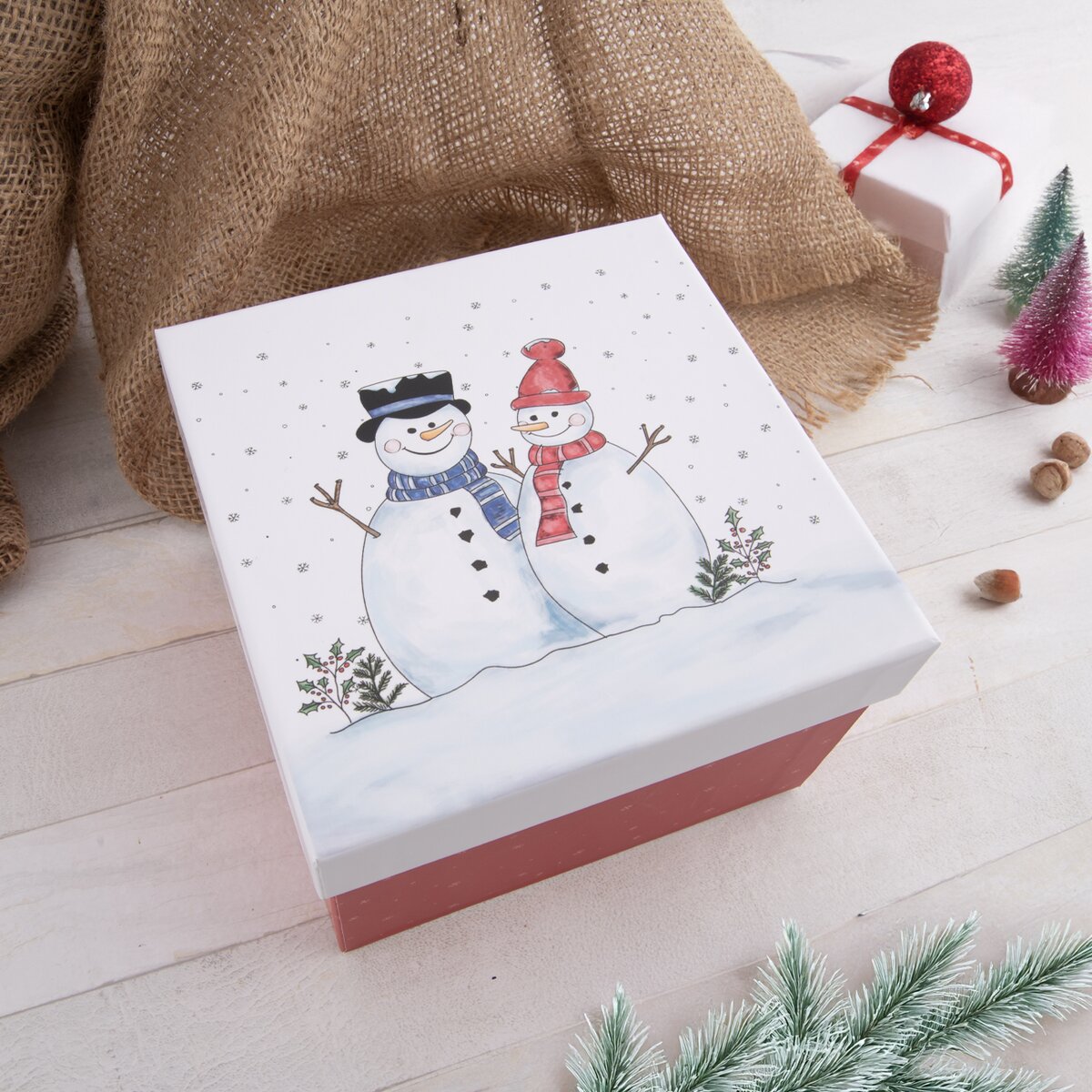 Kód produktu 823103Originální červená papírová krabice SNĚHULÁK má bílé víko s milým motivem dvou sněhuláků. Je určena k pohodlnému balení dárků.