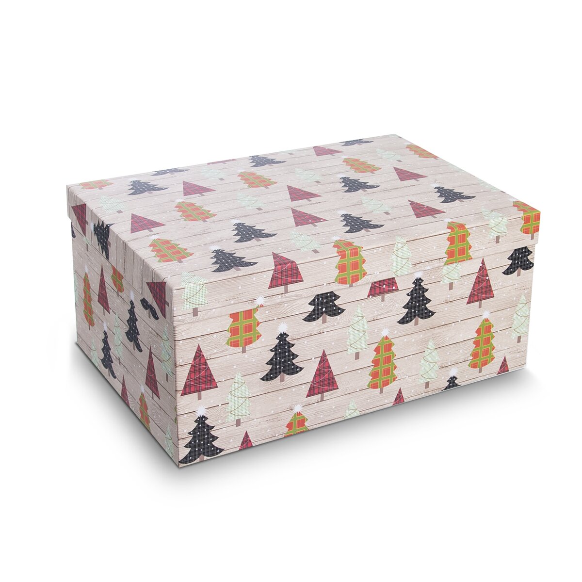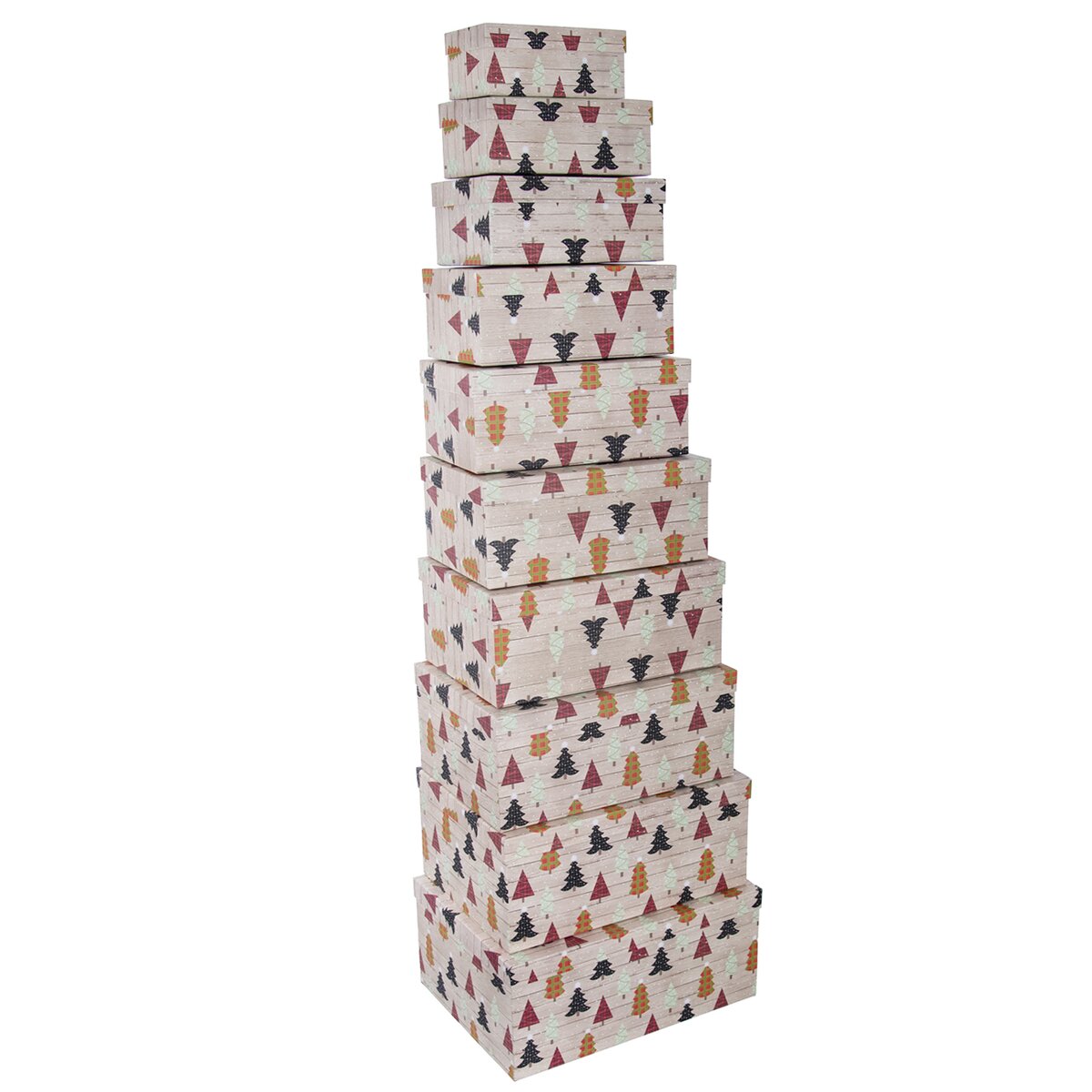 Jsou vyrobené z pevného papíru a zdobí je barevný dekor vánočních stromků. Sada obsahuje deset krabic v různých velikostech.
