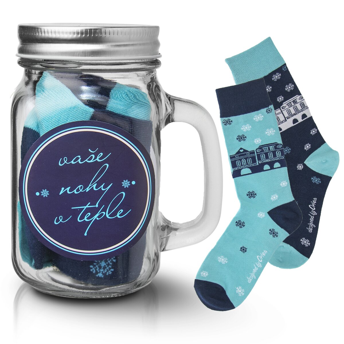 Sklenice s víčkem uvnitř ukrývá pár barevných ponožek. Skvělý a vtipný dárek. Skleničku s uchem můžete využít na vaše oblíbené nápoje, třeba smoothie nebo osvěžující limonádu, ale může posloužit také jako ukládací dóza na sušené ovoce, oříšky, bonbóny a jiné dobroty.