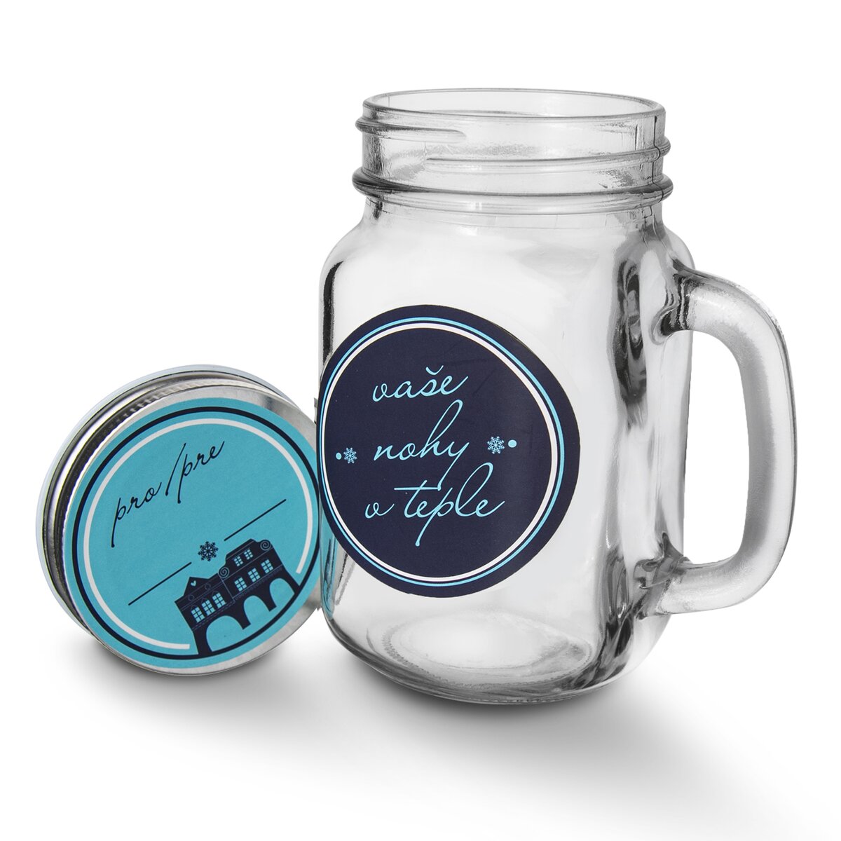Kód produktu 129730Dárková sklenička o objemu 0,45 l s uchem a kovovým šroubovacím uzávěrem z kolekce DOMKY, doplněná o dvojici rozdílných ponožek se stejným motivem.