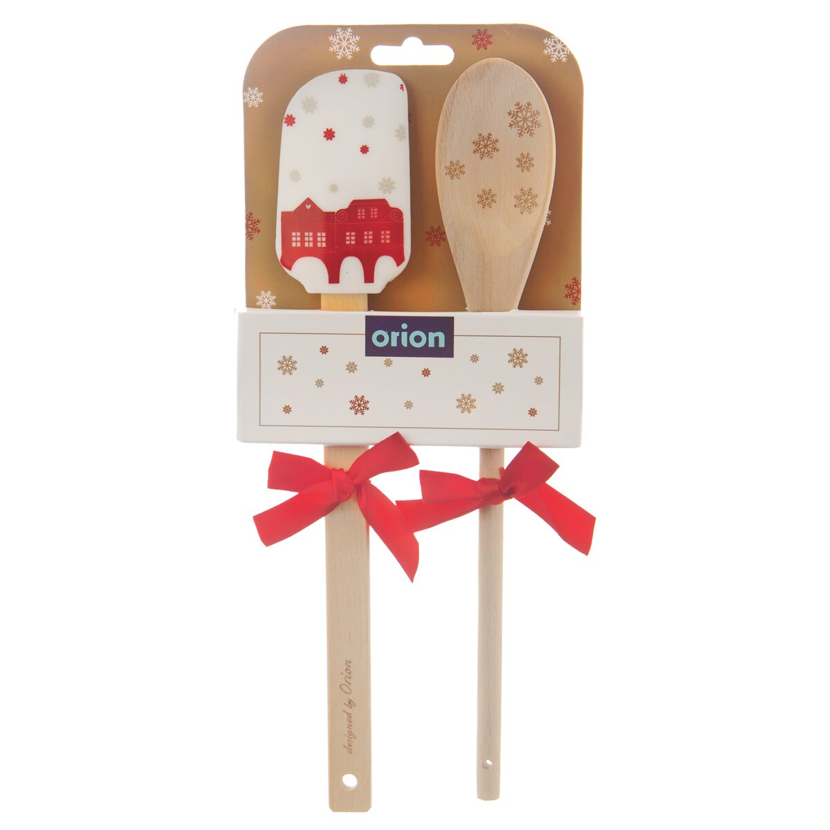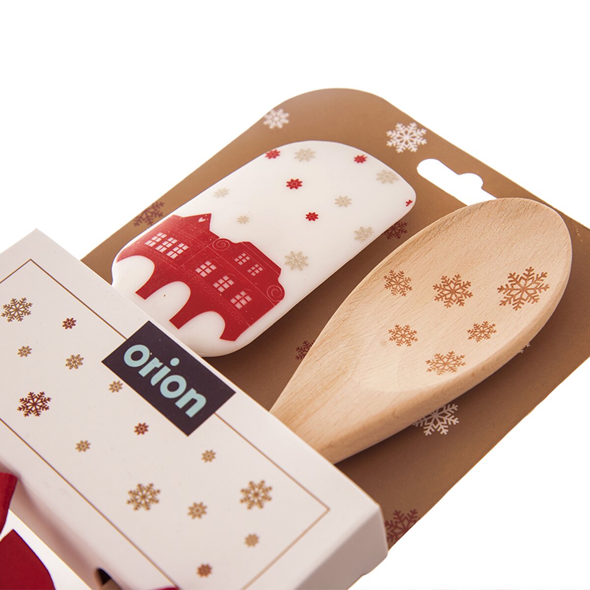 Kód produktu 142840Sada silikonové kuchyňské stěrky s vánočním motivem domků na bílém pozadí a dřevěné vařečky je vhodná jako zajímavý dárek pro nadšené i sváteční kuchaře a kuchařky.