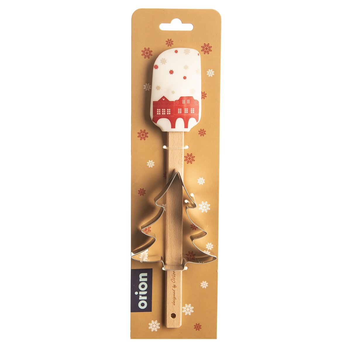 Silikonová stěrka v bílé barvě s motivem červených domků a zlatých vloček bude pěknou dekorací mezi ostatním náčiním na kuchyňské lince, ale také praktickým náčiním o rozměru 5x29 cm. S její pomocí vytřete i poslední zbytky krému, polevy nebo řídkého těsta z mísy. Vykrajovačku ve tvaru stromku o velikosti 7x9 cm lze využít pro výrobu perníčků nebo lineckého cukroví.
