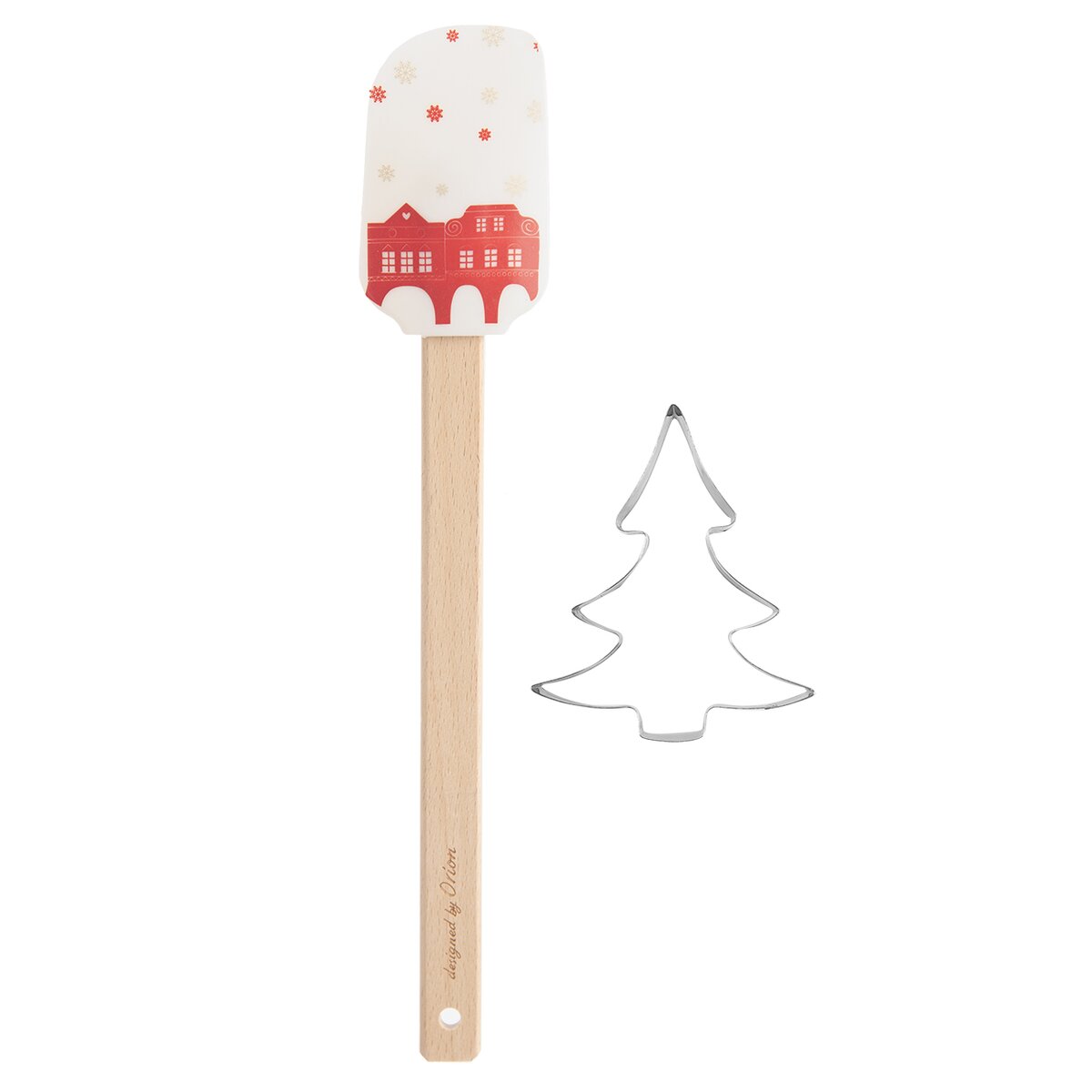 Kód produktu 142838Sada silikonové kuchyňské stěrky s vánočním motivem domků na bílém pozadí a vykrajovačky z pocínovaného plechu, vhodná jako zajímavý dárek.