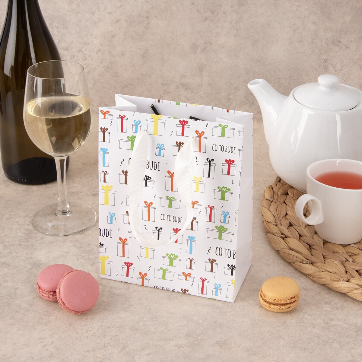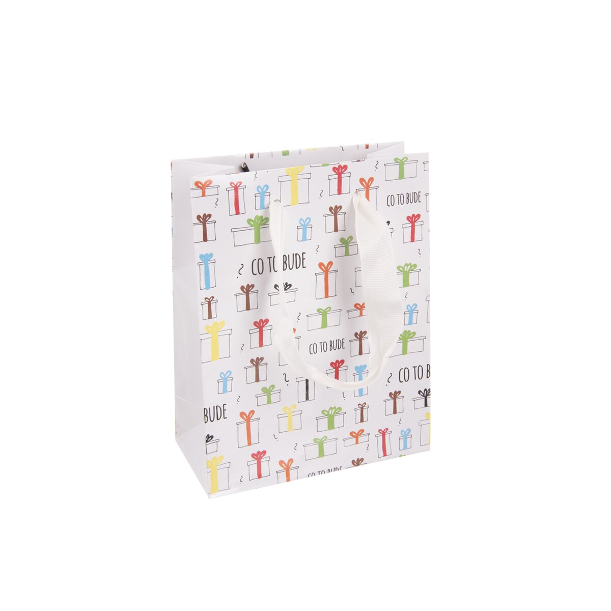 Kód produktu 822758Papírová dárková taška CO TO BUDE o rozměrech 14x7x18 cm s originálním potiskem je vhodná k uložení nejrůznějších dárků.