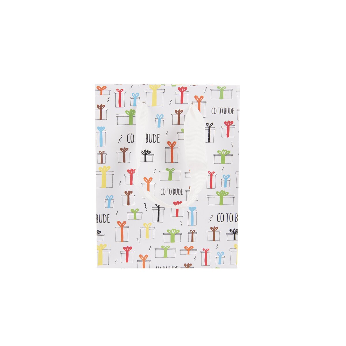 Papírová dárková taška CO TO BUDE o rozměrech 14x7x18 cm s originálním potiskem je vhodná k uložení nejrůznějších dárků.