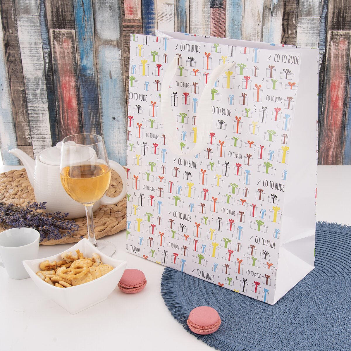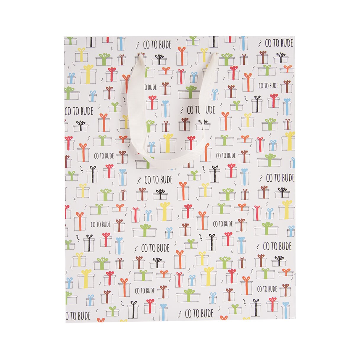 Kód produktu 822762Papírová dárková taška CO TO BUDE o rozměrech 26x12x32 cm s originálním potiskem je vhodná k uložení nejrůznějších dárků.