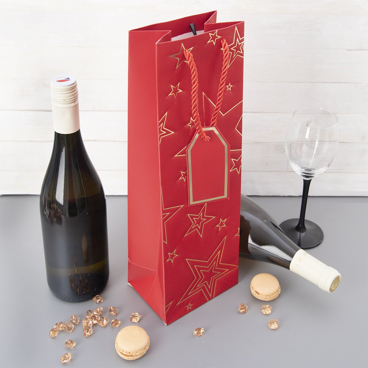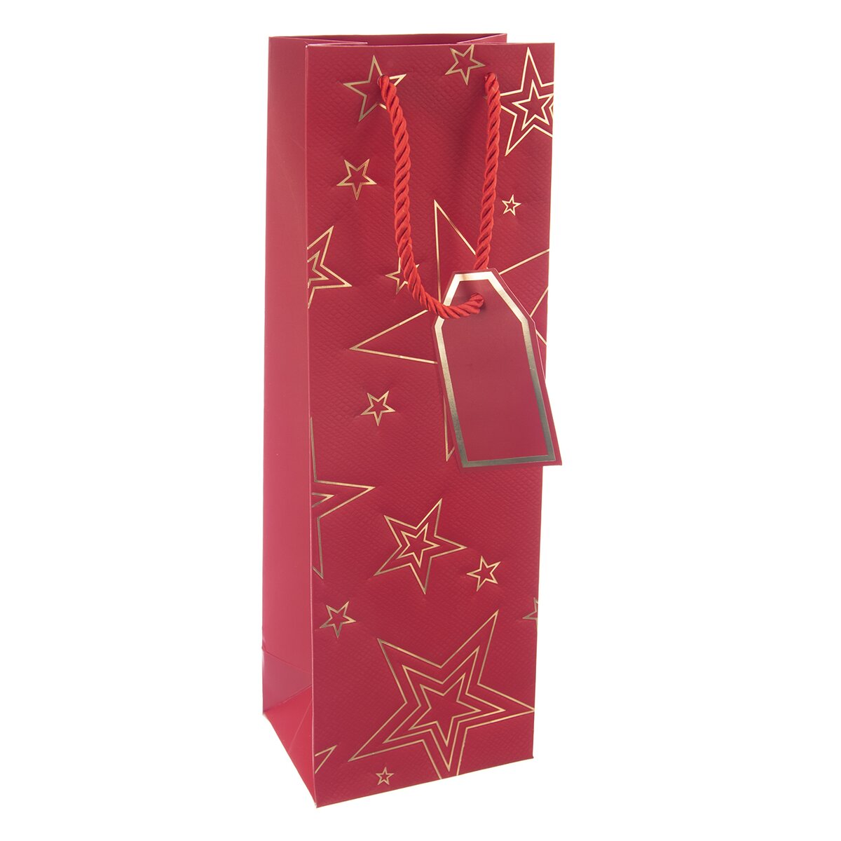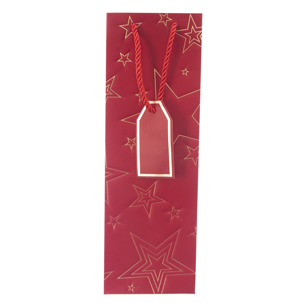 Kód produktu 822751Papírová dárková taška na víno o rozměrech 12x9x36 cm v elegantním červeném provedení, zdobená dekorem hvězd.