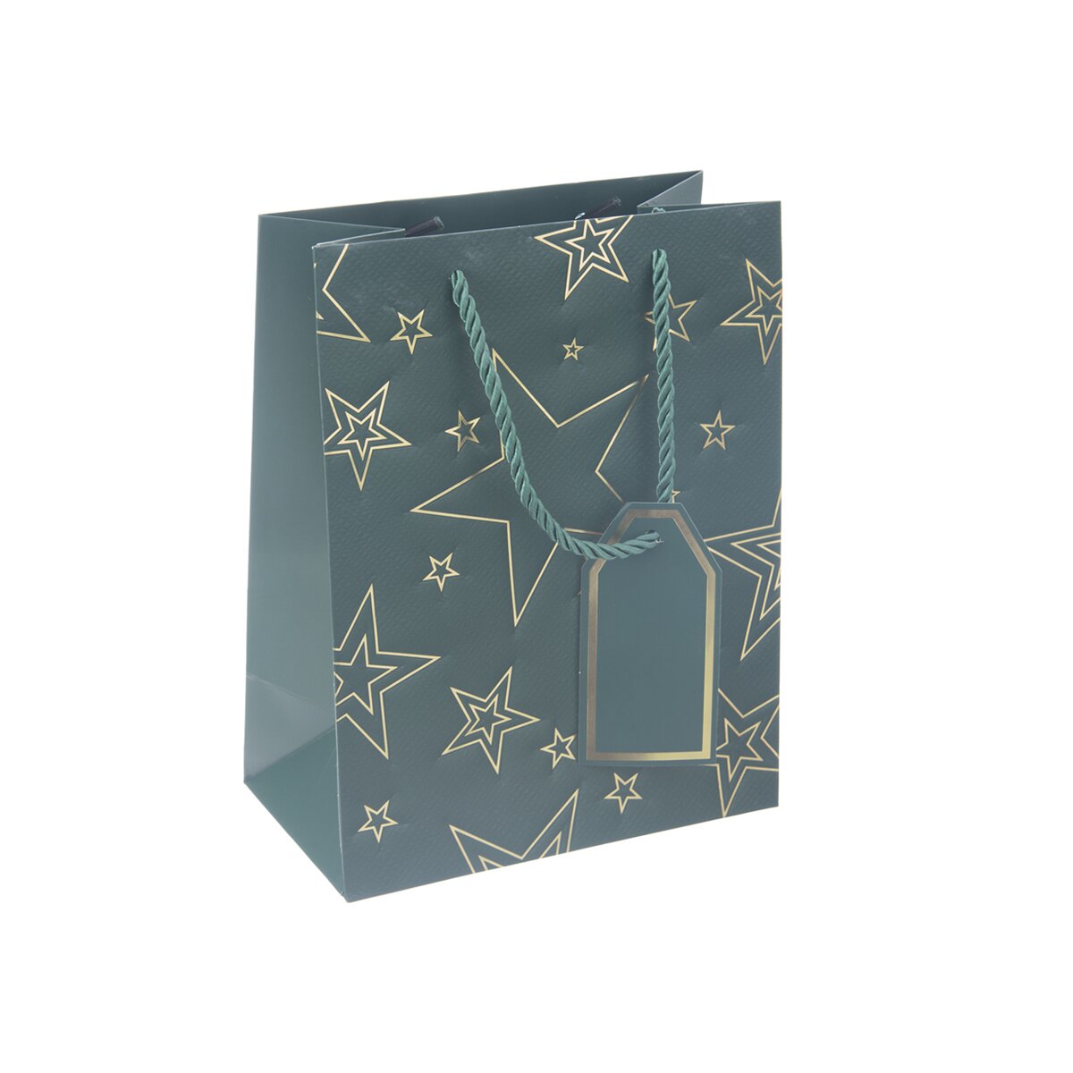 Kód produktu 822744Menší papírová dárková taška o rozměrech 18x10x23 cm je v zeleném provedení, zdobená zlatými linkami hvězd.
