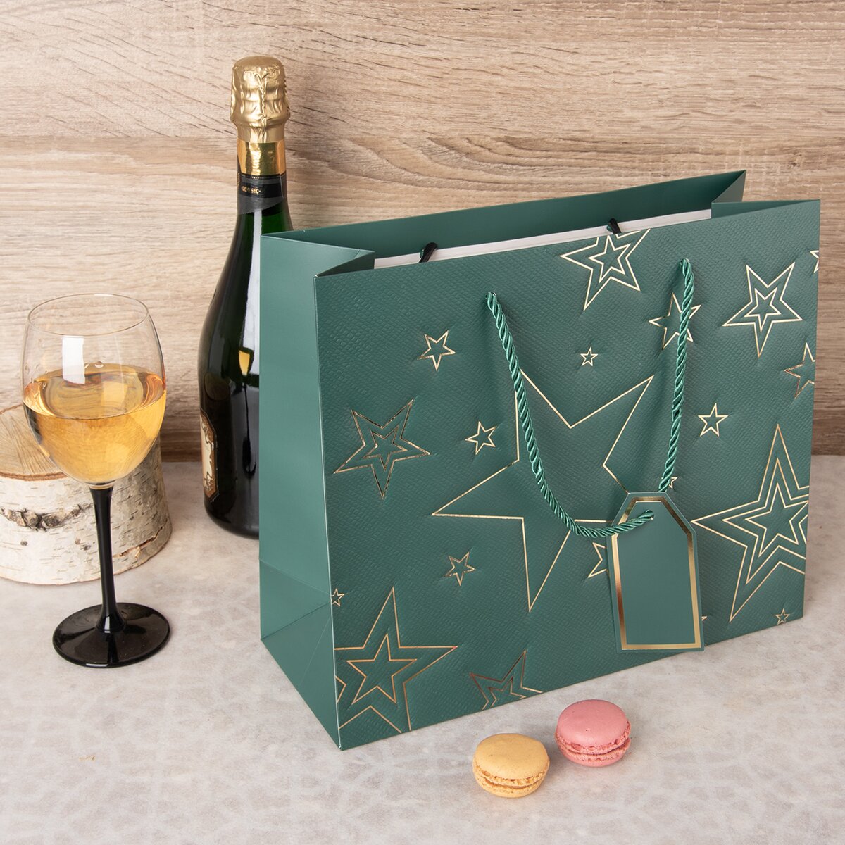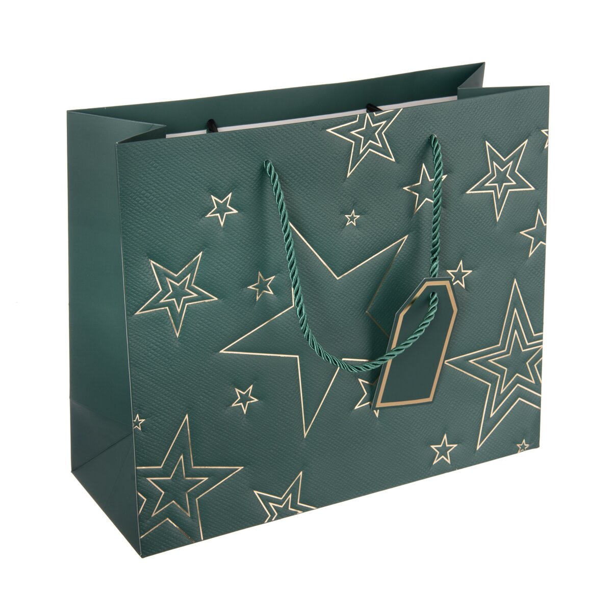 Kód produktu 822754Papírová dárková taška o rozměrech 31x12x26 cm v luxusním zeleném provedení. Z přední strany je zdobena plastickým dekorem s decentními linkami ve zlatém odstínu.