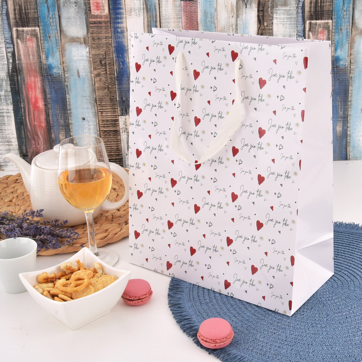 Větší dárková taška JEN PRO TEBE je perfektním místem k uložení nejrůznějších dárků, nejen tzv. "měkoušů". Pro partnera, kamaráda, rodiče, kolegu, ale i při narozeninách nebo výročí.