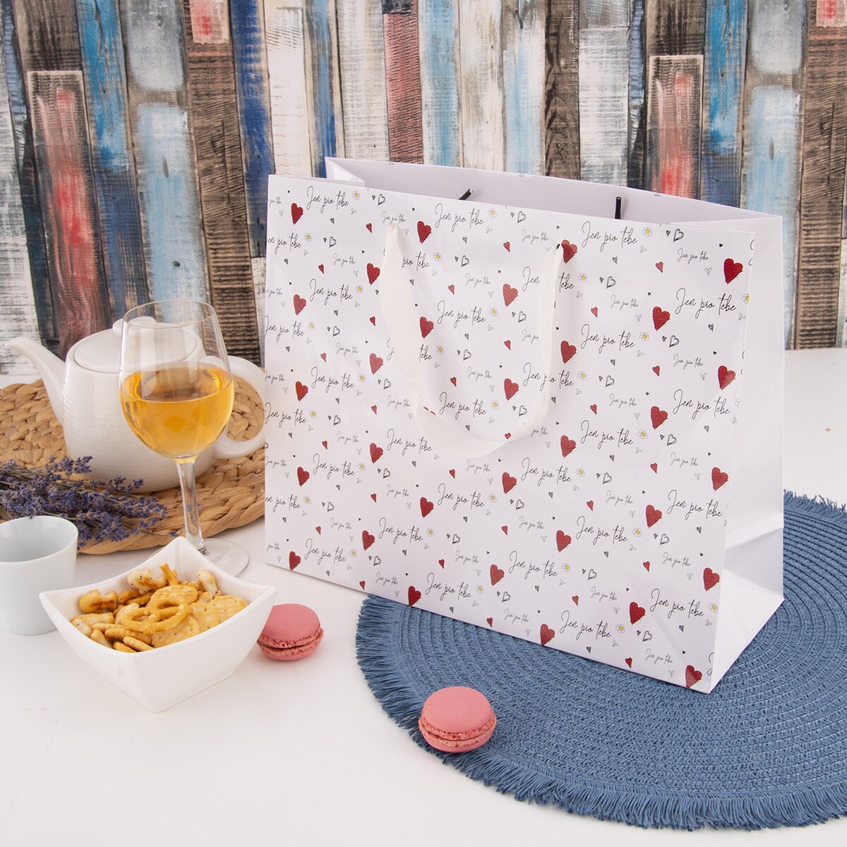 Kód produktu 822784Papírová dárková taška JEN PRO TEBE o rozměrech 32x12x26 cm s originálním potiskem je vhodná k uložení nejrůznějších dárků.