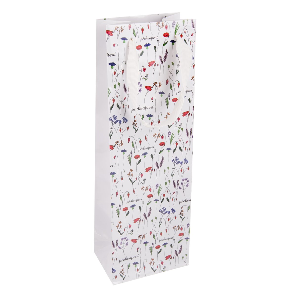 Užší dárková taška PŘEKVAPENÍ je skvělým místem k uložení dobrého vína, pálenky, oblíbeného likéru nebo domácí šťávy v zajímavé láhvi. Třeba pro partnera, kamarádku, kolegu, při narozeninách nebo výročí.