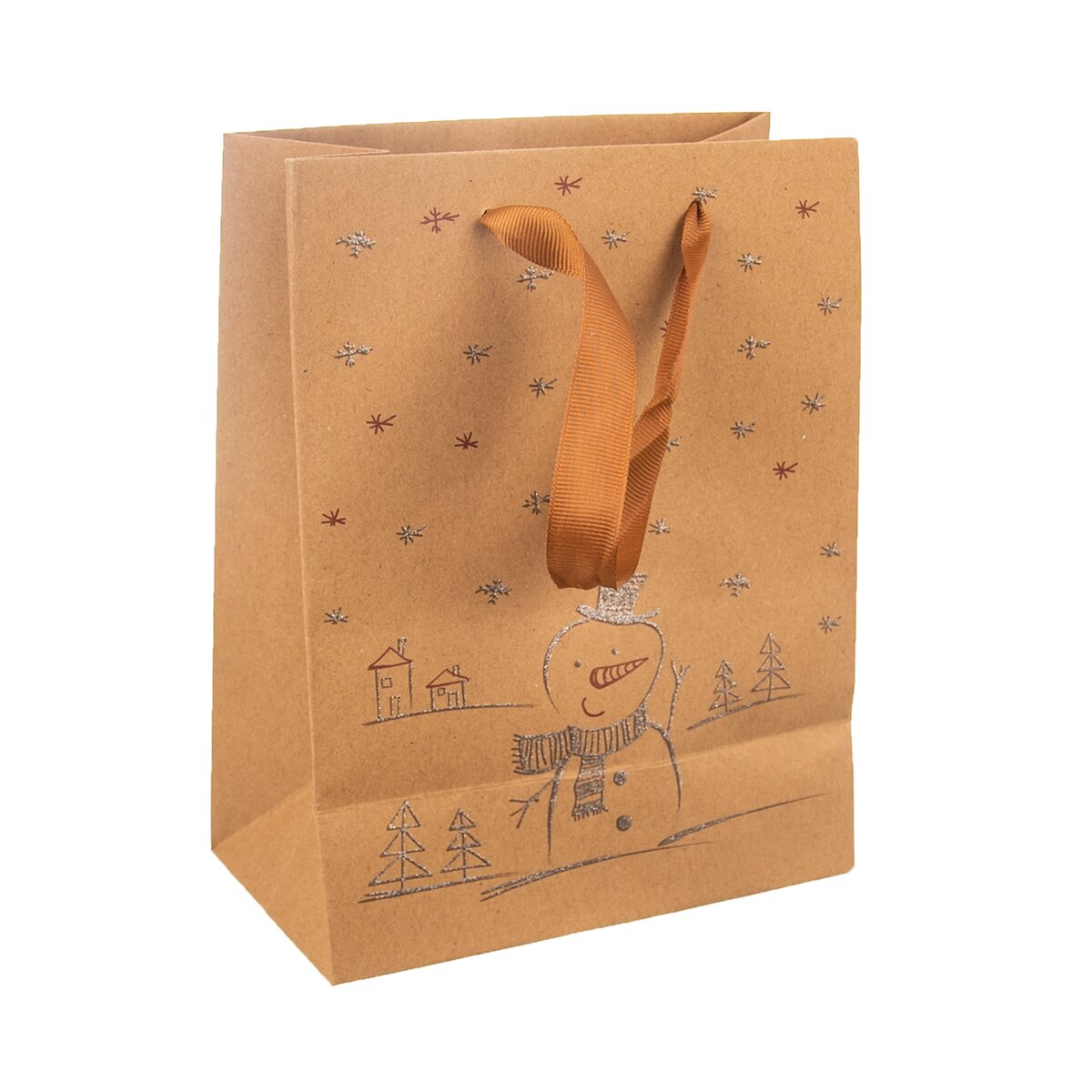 Papírová taška velikosti 18x10x23 cm zaujme svým jemným dekorem padajících vloček a sněhuláka. Taška má také papírovou cedulku s volným místem pro vypsání jména a mašli namísto ucha.