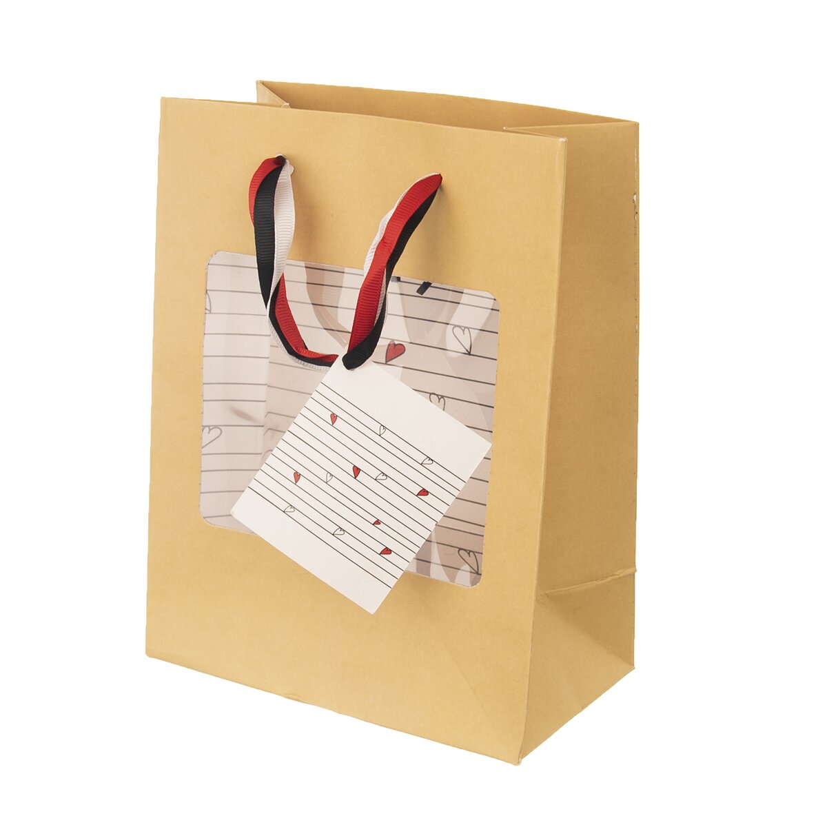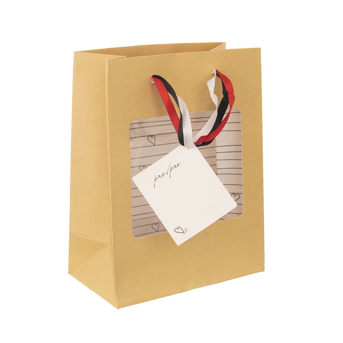 Kód produktu 822706Papírová dárková taška o rozměrech 18×23x10 cm s průhledem na přední straně a motivem srdcí uvnitř a na jmenovce.