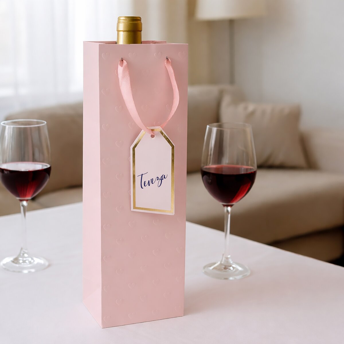 Je doplněná jmenovkou, kam lze napsat věnování nebo jméno obdarovaného. S jejím přenášením pomohou držadla z růžové polyesterové stužky.
