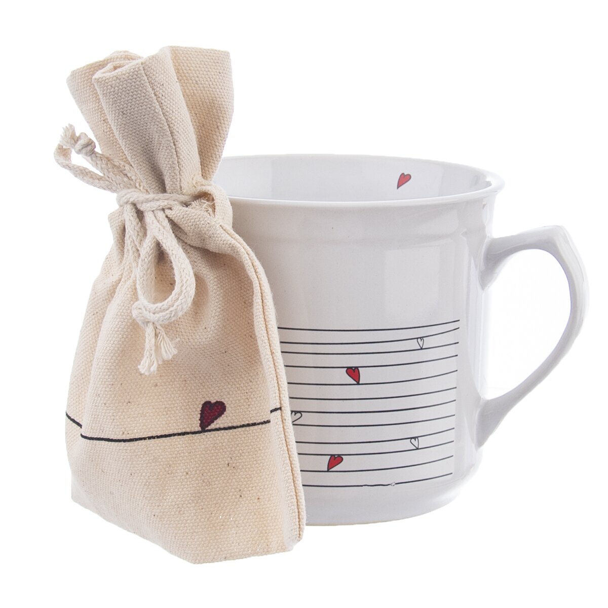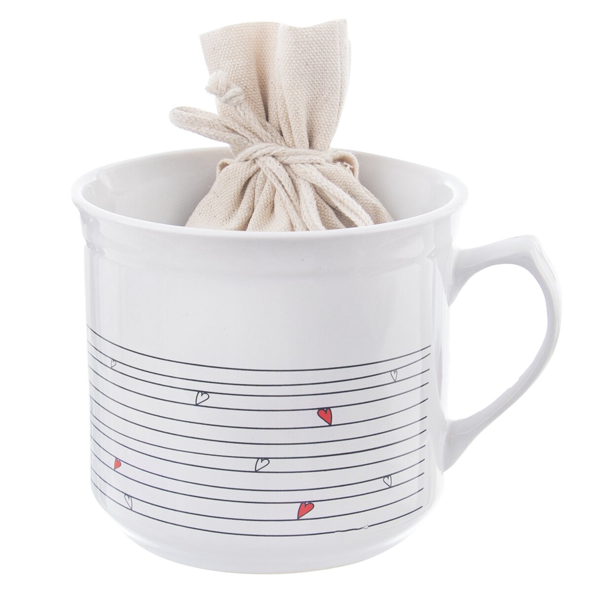 Kód produktu 128852Bílý keramický hrnek o objemu 0,5 l, s dekorem linek a srdíček, je doplněn pytlíčkem na sypaný čaj nebo sušené bylinky. Krásný a zároveň praktický dárek nejen pro milovníky čaje.