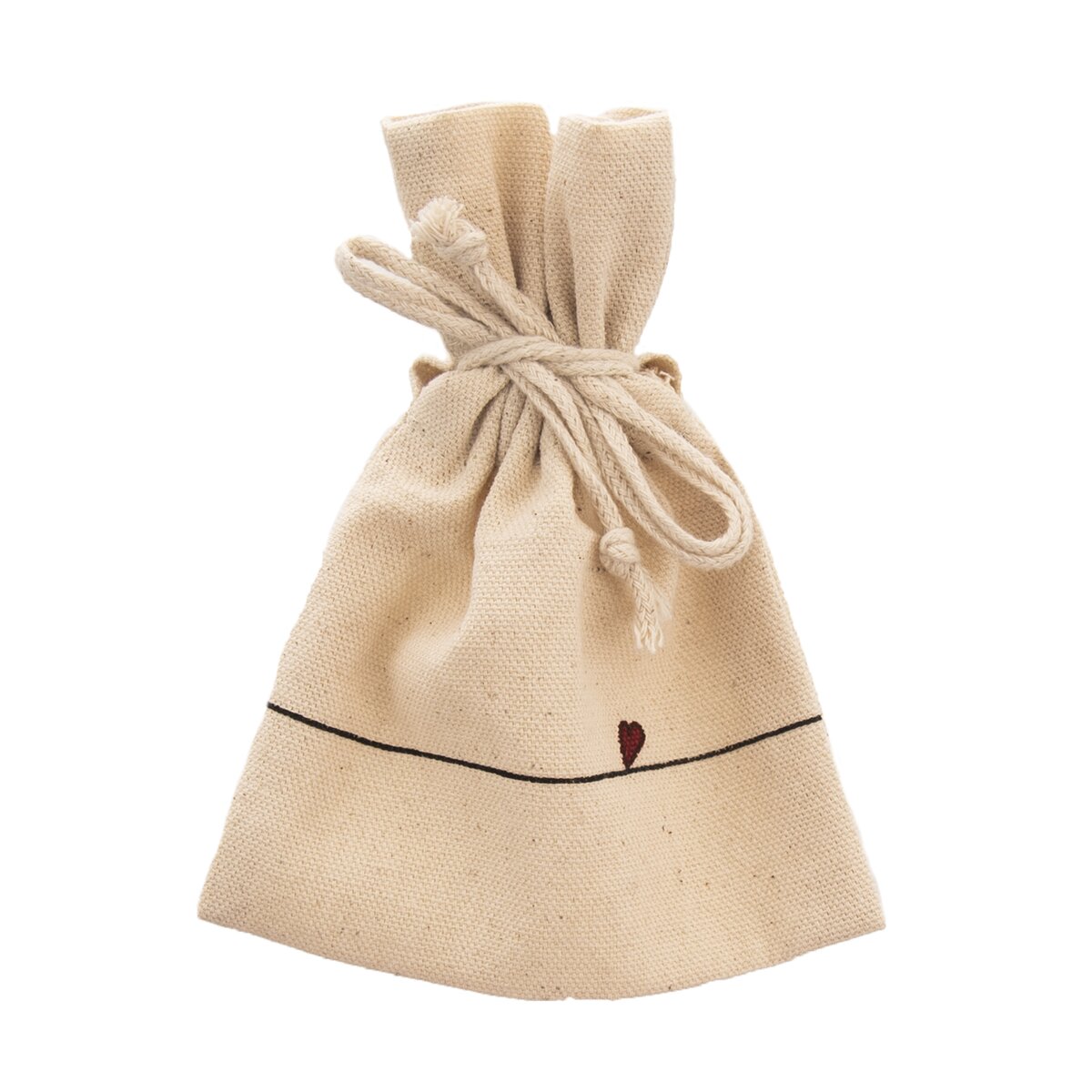 Je zdoben dekorem jemných linek a srdíček, uvnitř je vložen bavlněný sáček stažený šňůrkou, vhodný na sypaný čaj nebo sušené bylinky, takže se může stát krásným dárkem pro kamarádku, maminku nebo dobrého známého.