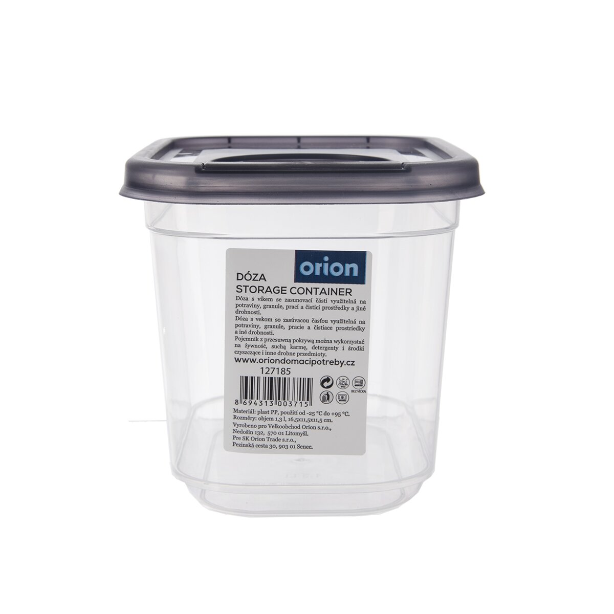 Kód produktu 127185Obdélníková plastová dóza velikosti 16,5x11,5x11,5 cm s šedým víčkem, které má posunovací část, takže vložené suroviny a drobné předměty lze snadno vysypat.