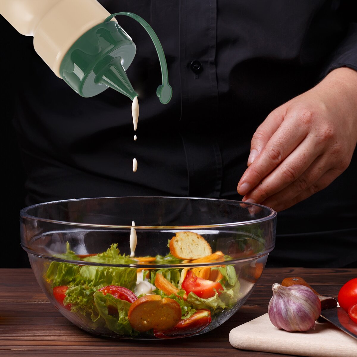 Láhev z plastu HDPE má stylový potisk, který vznikl v dílně našich designérů, je uzavřena víčkem z plastu PP, kterou ještě zajišťuje uzávěr hrotu, aby obsah nevysychal nebo při uložení v lednici nepronikalo aroma majonézy nebo obdobného dresingu k ostatním potravinám. Snese teplotu až do +40°C.