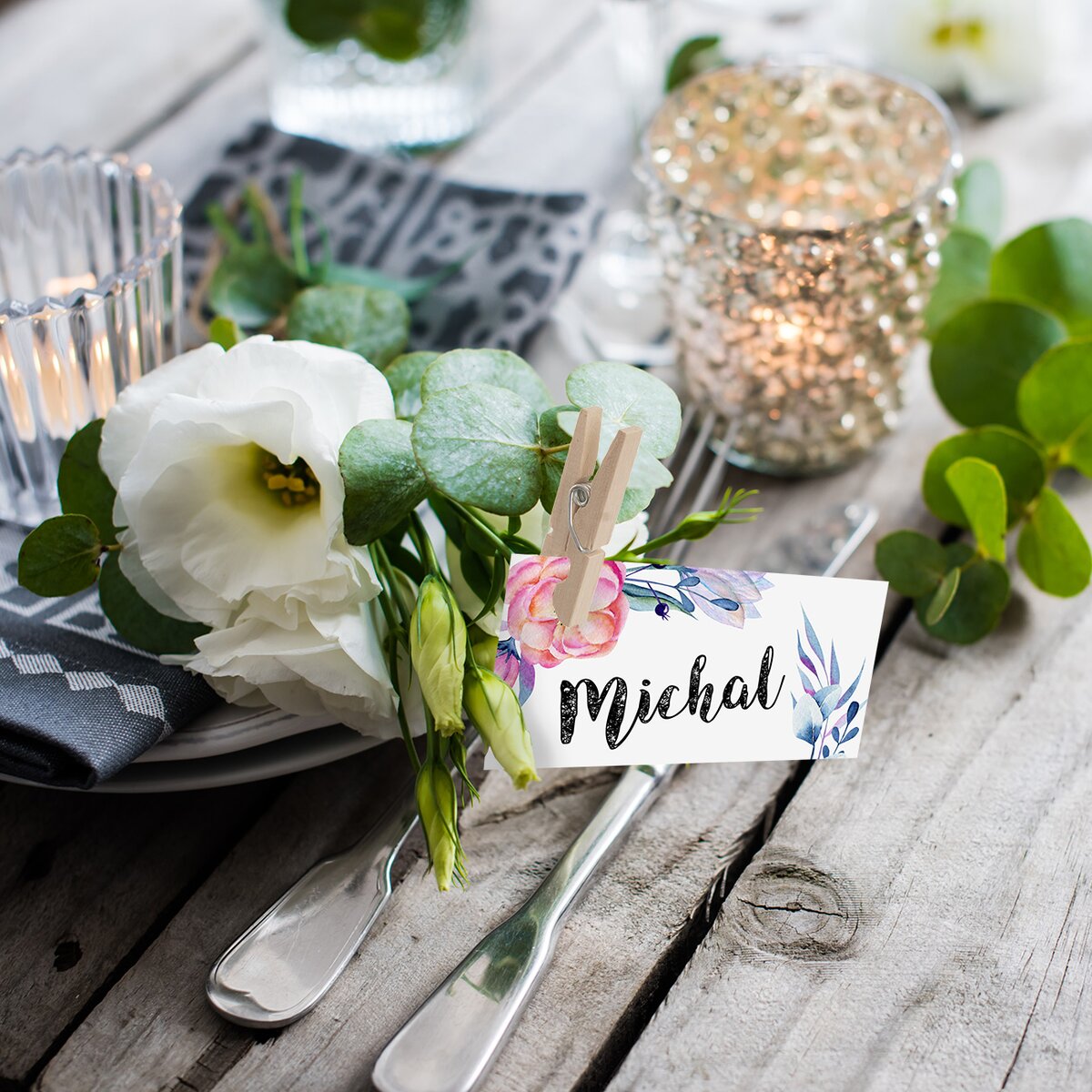 Kolíčky můžete nabarvit akrylovou barvou, získají zajímavou patinu, tón, který bude ladit k zabalenému dárku, přání nebo k ostatním dekoracím v interiéru. Malá drobnost, která oživí i hand made dárky pro vaše blízké. A zasedací pořádek na pěkném papíře bude hračka, stačí kartičky připevnit na ubrousky u krásně prostřeného stolu, na oslavě i u svatební tabule.