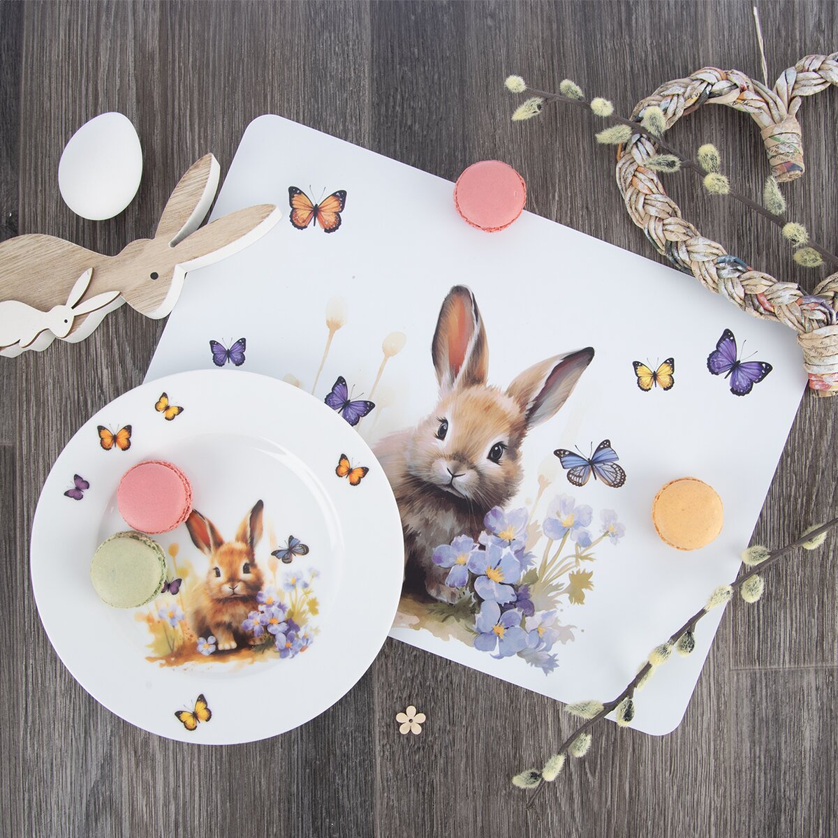 Dezertní talíř s roztomilým zajíčkem je jako stvořený k podávání vláčného mazance, bábovky nebo kváskového chleba s pomazánkou a pažitkou.